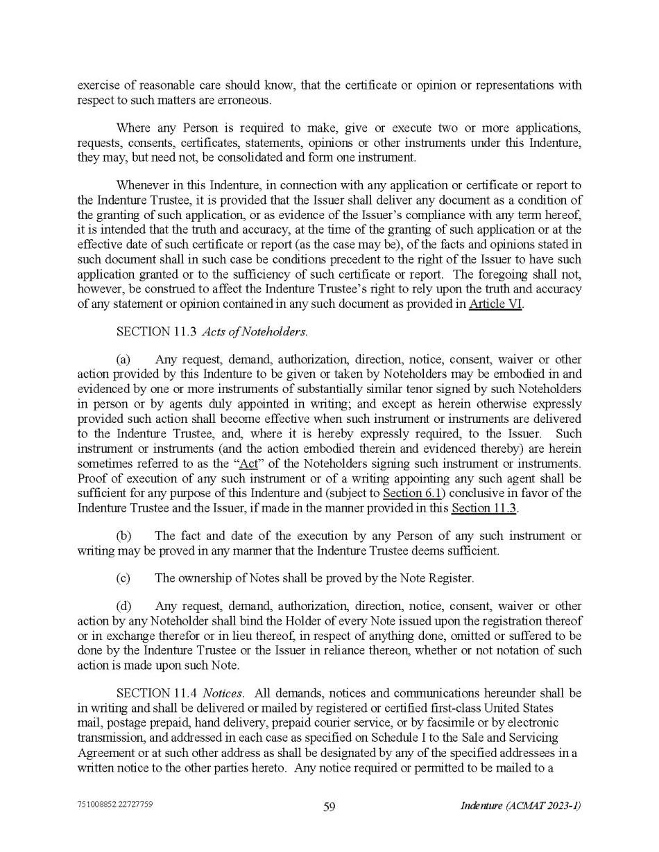 751008852 22727759 59 Indenture (ACMAT 2023 - 1) exercise of reasonable care should know, that the certificate or opinion or representations with respect to such matters are erroneous. Where any Person is required to make, give or execute two or more applications, requests, consents, certificates, statements, opinions or other instruments under this Indenture, they may, but need not, be consolidated and form one instrument . Whenever in this Indenture, in connection with any application or certificate or report to the Indenture Trustee, it is provided that the Issuer shall deliver any document as a condition of the granting of such application, or as evidence of the Issuer’s compliance with any term hereof, it is intended that the truth and accuracy, at the time of the granting of such application or at the effective date of such certificate or report (as the case may be), of the facts and opinions stated in such document shall in such case be conditions precedent to the right of the Issuer to have such application granted or to the sufficiency of such certificate or report . The foregoing shall not, however, be construed to affect the Indenture Trustee’s right to rely upon the truth and accuracy of any statement or opinion contained in any such document as provided in Article VI . SECTION 11.3 Acts of Noteholders . (a) Any request, demand, authorization, direction, notice, consent, waiver or other action provided by this Indenture to be given or taken by Noteholders may be embodied in and evidenced by one or more instruments of substantially similar tenor signed by such Noteholders in person or by agents duly appointed in writing ; and except as herein otherwise expressly provided such action shall become effective when such instrument or instruments are delivered to the Indenture Trustee, and, where it is hereby expressly required, to the Issuer . Such instrument or instruments (and the action embodied therein and evidenced thereby) are herein sometimes referred to as the “ Act ” of the Noteholders signing such instrument or instruments . Proof of execution of any such instrument or of a writing appointing any such agent shall be sufficient for any purpose of this Indenture and (subject to Section 6 . 1 ) conclusive in favor of the Indenture Trustee and the Issuer, if made in the manner provided in this Section 11 . 3 . (b) The fact and date of the execution by any Person of any such instrument or writing may be proved in any manner that the Indenture Trustee deems sufficient . (c) The ownership of Notes shall be proved by the Note Register. (d) Any request, demand, authorization, direction, notice, consent, waiver or other action by any Noteholder shall bind the Holder of every Note issued upon the registration thereof or in exchange therefor or in lieu thereof, in respect of anything done, omitted or suffered to be done by the Indenture Trustee or the Issuer in reliance thereon, whether or not notation of such action is made upon such Note . SECTION 11.4 Notices . All demands, notices and communications hereunder shall be in writing and shall be delivered or mailed by registered or certified first - class United States mail, postage prepaid, hand delivery, prepaid courier service, or by facsimile or by electronic transmission, and addressed in each case as specified on Schedule I to the Sale and Servicing Agreement or at such other address as shall be designated by any of the specified addressees in a written notice to the other parties hereto. Any notice required or permitted to be mailed to a