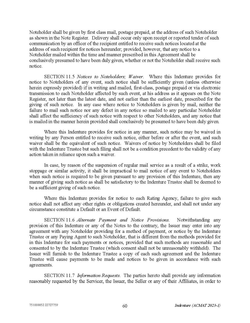 751008852 22727759 60 Indenture (ACMAT 2023 - 1) Noteholder shall be given by first class mail, postage prepaid, at the address of such Noteholder as shown in the Note Register. Delivery shall occur only upon receipt or reported tender of such communication by an officer of the recipient entitled to receive such notices located at the address of such recipient for notices hereunder; provided, however, that any notice to a Noteholder mailed within the time and manner prescribed in this Agreement shall be conclusively presumed to have been duly given, whether or not the Noteholder shall receive such notice. SECTION 11 . 5 Notices to Noteholders ; Waiver . Where this Indenture provides for notice to Noteholders of any event, such notice shall be sufficiently given (unless otherwise herein expressly provided) if in writing and mailed, first - class, postage prepaid or via electronic transmission to each Noteholder affected by such event, at his address as it appears on the Note Register, not later than the latest date, and not earlier than the earliest date, prescribed for the giving of such notice . In any case where notice to Noteholders is given by mail, neither the failure to mail such notice nor any defect in any notice so mailed to any particular Noteholder shall affect the sufficiency of such notice with respect to other Noteholders, and any notice that is mailed in the manner herein provided shall conclusively be presumed to have been duly given . Where this Indenture provides for notice in any manner, such notice may be waived in writing by any Person entitled to receive such notice, either before or after the event, and such waiver shall be the equivalent of such notice . Waivers of notice by Noteholders shall be filed with the Indenture Trustee but such filing shall not be a condition precedent to the validity of any action taken in reliance upon such a waiver . In case, by reason of the suspension of regular mail service as a result of a strike, work stoppage or similar activity, it shall be impractical to mail notice of any event to Noteholders when such notice is required to be given pursuant to any provision of this Indenture, then any manner of giving such notice as shall be satisfactory to the Indenture Trustee shall be deemed to be a sufficient giving of such notice . Where this Indenture provides for notice to each Rating Agency, failure to give such notice shall not affect any other rights or obligations created hereunder, and shall not under any circumstance constitute a Default or an Event of Default . SECTION 11 . 6 Alternate Payment and Notice Provisions . Notwithstanding any provision of this Indenture or any of the Notes to the contrary, the Issuer may enter into any agreement with any Noteholder providing for a method of payment, or notice by the Indenture Trustee or any Paying Agent to such Noteholder, that is different from the methods provided for in this Indenture for such payments or notices, provided that such methods are reasonable and consented to by the Indenture Trustee (which consent shall not be unreasonably withheld) . The Issuer will furnish to the Indenture Trustee a copy of each such agreement and the Indenture Trustee will cause payments to be made and notices to be given in accordance with such agreements . SECTION 11 . 7 Information Requests . The parties hereto shall provide any information reasonably requested by the Servicer, the Issuer, the Seller or any of their Affiliates, in order to