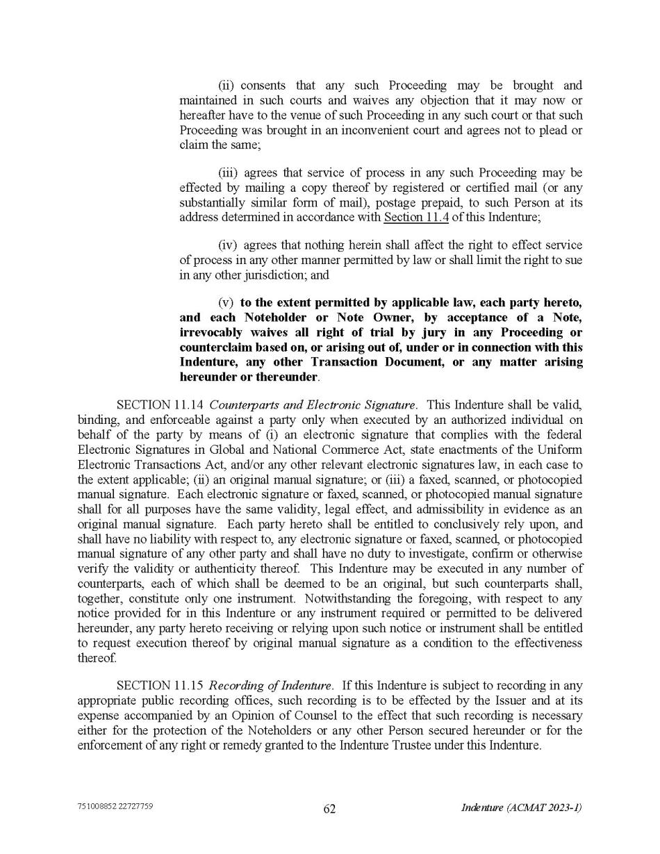 751008852 22727759 62 Indenture (ACMAT 2023 - 1) (ii) consents that any such Proceeding may be brought and maintained in such courts and waives any objection that it may now or hereafter have to the venue of such Proceeding in any such court or that such Proceeding was brought in an inconvenient court and agrees not to plead or claim the same ; (iii) agrees that service of process in any such Proceeding may be effected by mailing a copy thereof by registered or certified mail (or any substantially similar form of mail), postage prepaid, to such Person at its address determined in accordance with Section 11 . 4 of this Indenture ; (iv) agrees that nothing herein shall affect the right to effect service of process in any other manner permitted by law or shall limit the right to sue in any other jurisdiction ; and (v) to the extent permitted by applicable law, each party hereto, and each Noteholder or Note Owner, by acceptance of a Note, irrevocably waives all right of trial by jury in any Proceeding or counterclaim based on, or arising out of, under or in connection with this Indenture, any other Transaction Document, or any matter arising hereunder or thereunder . SECTION 11 . 14 Counterparts and Electronic Signature . This Indenture shall be valid, binding, and enforceable against a party only when executed by an authorized individual on behalf of the party by means of (i) an electronic signature that complies with the federal Electronic Signatures in Global and National Commerce Act, state enactments of the Uniform Electronic Transactions Act, and/or any other relevant electronic signatures law, in each case to the extent applicable ; (ii) an original manual signature ; or (iii) a faxed, scanned, or photocopied manual signature . Each electronic signature or faxed, scanned, or photocopied manual signature shall for all purposes have the same validity, legal effect, and admissibility in evidence as an original manual signature . Each party hereto shall be entitled to conclusively rely upon, and shall have no liability with respect to, any electronic signature or faxed, scanned, or photocopied manual signature of any other party and shall have no duty to investigate, confirm or otherwise verify the validity or authenticity thereof . This Indenture may be executed in any number of counterparts, each of which shall be deemed to be an original, but such counterparts shall, together, constitute only one instrument . Notwithstanding the foregoing, with respect to any notice provided for in this Indenture or any instrument required or permitted to be delivered hereunder, any party hereto receiving or relying upon such notice or instrument shall be entitled to request execution thereof by original manual signature as a condition to the effectiveness thereof . SECTION 11 . 15 Recording of Indenture . If this Indenture is subject to recording in any appropriate public recording offices, such recording is to be effected by the Issuer and at its expense accompanied by an Opinion of Counsel to the effect that such recording is necessary either for the protection of the Noteholders or any other Person secured hereunder or for the enforcement of any right or remedy granted to the Indenture Trustee under this Indenture .