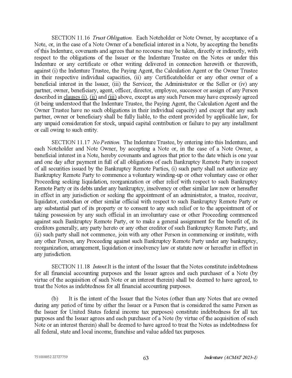 751008852 22727759 63 Indenture (ACMAT 2023 - 1) SECTION 11 . 16 Trust Obligation . Each Noteholder or Note Owner, by acceptance of a Note, or, in the case of a Note Owner of a beneficial interest in a Note, by accepting the benefits of this Indenture, covenants and agrees that no recourse may be taken, directly or indirectly, with respect to the obligations of the Issuer or the Indenture Trustee on the Notes or under this Indenture or any certificate or other writing delivered in connection herewith or therewith, against (i) the Indenture Trustee, the Paying Agent, the Calculation Agent or the Owner Trustee in their respective individual capacities, (ii) any Certificateholder or any other owner of a beneficial interest in the Issuer, (iii) the Servicer, the Administrator or the Seller or (iv) any partner, owner, beneficiary, agent, officer, director, employee, successor or assign of any Person described in clauses (i) , (ii) and (iii) above, except as any such Person may have expressly agreed (it being understood that the Indenture Trustee, the Paying Agent, the Calculation Agent and the Owner Trustee have no such obligations in their individual capacity) and except that any such partner, owner or beneficiary shall be fully liable, to the extent provided by applicable law, for any unpaid consideration for stock, unpaid capital contribution or failure to pay any installment or call owing to such entity . SECTION 11 . 17 No Petition . The Indenture Trustee, by entering into this Indenture, and each Noteholder and Note Owner, by accepting a Note or, in the case of a Note Owner, a beneficial interest in a Note, hereby covenants and agrees that prior to the date which is one year and one day after payment in full of all obligations of each Bankruptcy Remote Party in respect of all securities issued by the Bankruptcy Remote Parties, (i) such party shall not authorize any Bankruptcy Remote Party to commence a voluntary winding - up or other voluntary case or other Proceeding seeking liquidation, reorganization or other relief with respect to such Bankruptcy Remote Party or its debts under any bankruptcy, insolvency or other similar law now or hereafter in effect in any jurisdiction or seeking the appointment of an administrator, a trustee, receiver, liquidator, custodian or other similar official with respect to such Bankruptcy Remote Party or any substantial part of its property or to consent to any such relief or to the appointment of or taking possession by any such official in an involuntary case or other Proceeding commenced against such Bankruptcy Remote Party, or to make a general assignment for the benefit of, its creditors generally, any party hereto or any other creditor of such Bankruptcy Remote Party, and (ii) such party shall not commence, join with any other Person in commencing or institute, with any other Person, any Proceeding against such Bankruptcy Remote Party under any bankruptcy, reorganization, arrangement, liquidation or insolvency law or statute now or hereafter in effect in any jurisdiction . SECTION 11 . 18 Intent . It is the intent of the Issuer that the Notes constitute indebtedness for all financial accounting purposes and the Issuer agrees and each purchaser of a Note (by virtue of the acquisition of such Note or an interest therein) shall be deemed to have agreed, to treat the Notes as indebtedness for all financial accounting purposes . (b) It is the intent of the Issuer that the Notes (other than any Notes that are owned during any period of time by either the Issuer or a Person that is considered the same Person as the Issuer for United States federal income tax purposes) constitute indebtedness for all tax purposes and the Issuer agrees and each purchaser of a Note (by virtue of the acquisition of such Note or an interest therein) shall be deemed to have agreed to treat the Notes as indebtedness for all federal, state and local income, franchise and value added tax purposes .