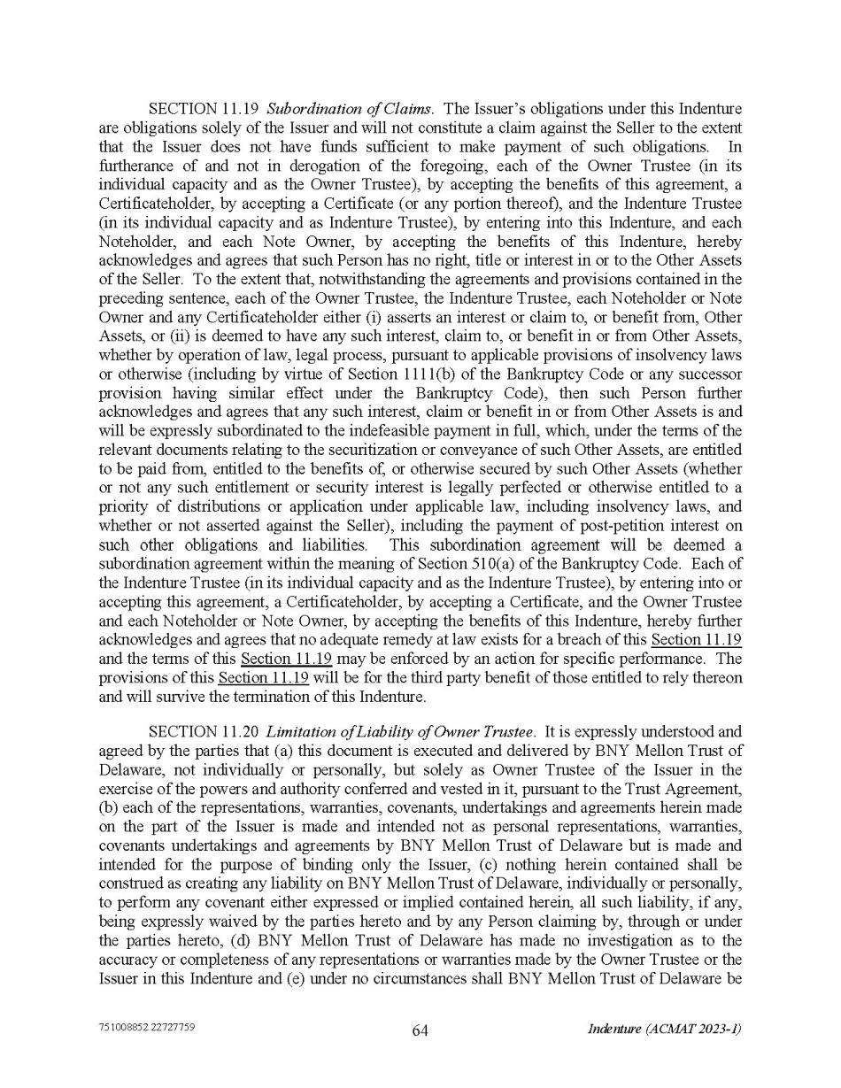 751008852 22727759 64 Indenture (ACMAT 2023 - 1) SECTION 11 . 19 Subordination of Claims . The Issuer’s obligations under this Indenture are obligations solely of the Issuer and will not constitute a claim against the Seller to the extent that the Issuer does not have funds sufficient to make payment of such obligations . In furtherance of and not in derogation of the foregoing, each of the Owner Trustee (in its individual capacity and as the Owner Trustee), by accepting the benefits of this agreement, a Certificateholder, by accepting a Certificate (or any portion thereof), and the Indenture Trustee (in its individual capacity and as Indenture Trustee), by entering into this Indenture, and each Noteholder, and each Note Owner, by accepting the benefits of this Indenture, hereby acknowledges and agrees that such Person has no right, title or interest in or to the Other Assets of the Seller . To the extent that, notwithstanding the agreements and provisions contained in the preceding sentence, each of the Owner Trustee, the Indenture Trustee, each Noteholder or Note Owner and any Certificateholder either (i) asserts an interest or claim to, or benefit from, Other Assets, or (ii) is deemed to have any such interest, claim to, or benefit in or from Other Assets, whether by operation of law, legal process, pursuant to applicable provisions of insolvency laws or otherwise (including by virtue of Section 1111 (b) of the Bankruptcy Code or any successor provision having similar effect under the Bankruptcy Code), then such Person further acknowledges and agrees that any such interest, claim or benefit in or from Other Assets is and will be expressly subordinated to the indefeasible payment in full, which, under the terms of the relevant documents relating to the securitization or conveyance of such Other Assets, are entitled to be paid from, entitled to the benefits of, or otherwise secured by such Other Assets (whether or not any such entitlement or security interest is legally perfected or otherwise entitled to a priority of distributions or application under applicable law, including insolvency laws, and whether or not asserted against the Seller), including the payment of post - petition interest on such other obligations and liabilities . This subordination agreement will be deemed a subordination agreement within the meaning of Section 510 (a) of the Bankruptcy Code . Each of the Indenture Trustee (in its individual capacity and as the Indenture Trustee), by entering into or accepting this agreement, a Certificateholder, by accepting a Certificate, and the Owner Trustee and each Noteholder or Note Owner, by accepting the benefits of this Indenture, hereby further acknowledges and agrees that no adequate remedy at law exists for a breach of this Section 11 . 19 and the terms of this Section 11 . 19 may be enforced by an action for specific performance . The provisions of this Section 11 . 19 will be for the third party benefit of those entitled to rely thereon and will survive the termination of this Indenture . SECTION 11 . 20 Limitation of Liability of Owner Trustee . It is expressly understood and agreed by the parties that (a) this document is executed and delivered by BNY Mellon Trust of Delaware, not individually or personally, but solely as Owner Trustee of the Issuer in the exercise of the powers and authority conferred and vested in it, pursuant to the Trust Agreement, (b) each of the representations, warranties, covenants, undertakings and agreements herein made on the part of the Issuer is made and intended not as personal representations, warranties, covenants undertakings and agreements by BNY Mellon Trust of Delaware but is made and intended for the purpose of binding only the Issuer, (c) nothing herein contained shall be construed as creating any liability on BNY Mellon Trust of Delaware, individually or personally, to perform any covenant either expressed or implied contained herein, all such liability, if any, being expressly waived by the parties hereto and by any Person claiming by, through or under the parties hereto, (d) BNY Mellon Trust of Delaware has made no investigation as to the accuracy or completeness of any representations or warranties made by the Owner Trustee or the Issuer in this Indenture and (e) under no circumstances shall BNY Mellon Trust of Delaware be