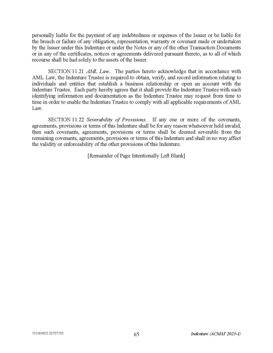751008852 22727759 65 Indenture (ACMAT 2023 - 1) personally liable for the payment of any indebtedness or expenses of the Issuer or be liable for the breach or failure of any obligation, representation, warranty or covenant made or undertaken by the Issuer under this Indenture or under the Notes or any of the other Transaction Documents or in any of the certificates, notices or agreements delivered pursuant thereto, as to all of which recourse shall be had solely to the assets of the Issuer . SECTION 11 . 21 AML Law . The parties hereto acknowledge that in accordance with AML Law, the Indenture Trustee is required to obtain, verify, and record information relating to individuals and entities that establish a business relationship or open an account with the Indenture Trustee . Each party hereby agrees that it shall provide the Indenture Trustee with such identifying information and documentation as the Indenture Trustee may request from time to time in order to enable the Indenture Trustee to comply with all applicable requirements of AML Law . SECTION 11 . 22 Severability of Provisions . If any one or more of the covenants, agreements, provisions or terms of this Indenture shall be for any reason whatsoever held invalid, then such covenants, agreements, provisions or terms shall be deemed severable from the remaining covenants, agreements, provisions or terms of this Indenture and shall in no way affect the validity or enforceability of the other provisions of this Indenture . [Remainder of Page Intentionally Left Blank]