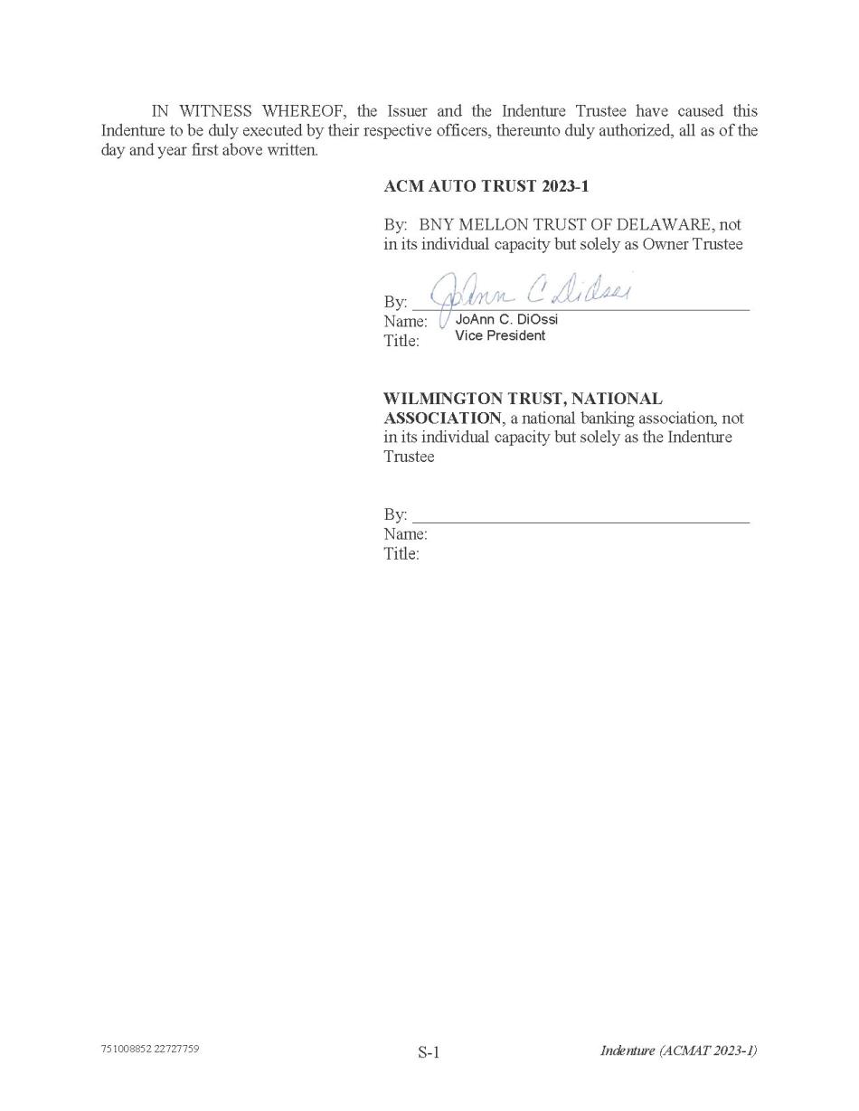 IN WITNESS WHEREOF, the Issuer and the Indenture Trustee have caused this Indenture to be duly executed by their respective officers, thereunto duly authorized, all as of the day and year first above written . ACM AUTO TRUST 2023 - 1 By: BNY MELLON TRUST OF DELAWARE, not in its individual capacity but solely as Owner Trustee By: Name: Title: WILMINGTON TRUST, NATIONAL ASSOCIATION , a national banking association, not in its individual capacity but solely as the Indenture Trustee By: Name: Title: JoAnn C. DiOssi Vice President 751008852 22727759 S - 1 Indenture (ACMAT 2023 - 1)