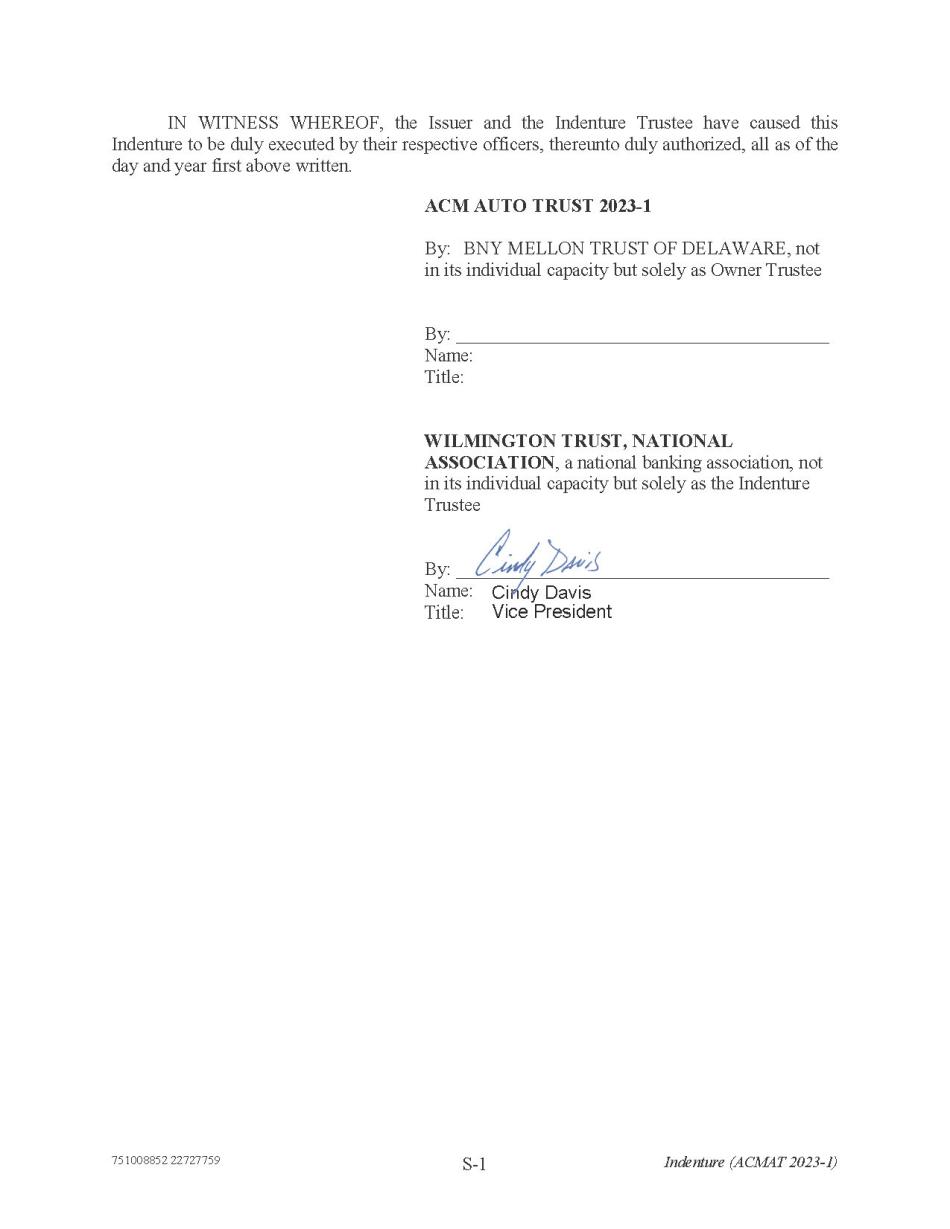 IN WITNESS WHEREOF, the Issuer and the Indenture Trustee have caused this Indenture to be duly executed by their respective officers, thereunto duly authorized, all as of the day and year first above written . ACM AUTO TRUST 2023 - 1 By: BNY MELLON TRUST OF DELAWARE, not in its individual capacity but solely as Owner Trustee By: Name: Title: WILMINGTON TRUST, NATIONAL ASSOCIATION , a national banking association, not in its individual capacity but solely as the Indenture Trustee By: Name: Title: Cindy Davis Vice President 751008852 22727759 S - 1 Indenture (ACMAT 2023 - 1)