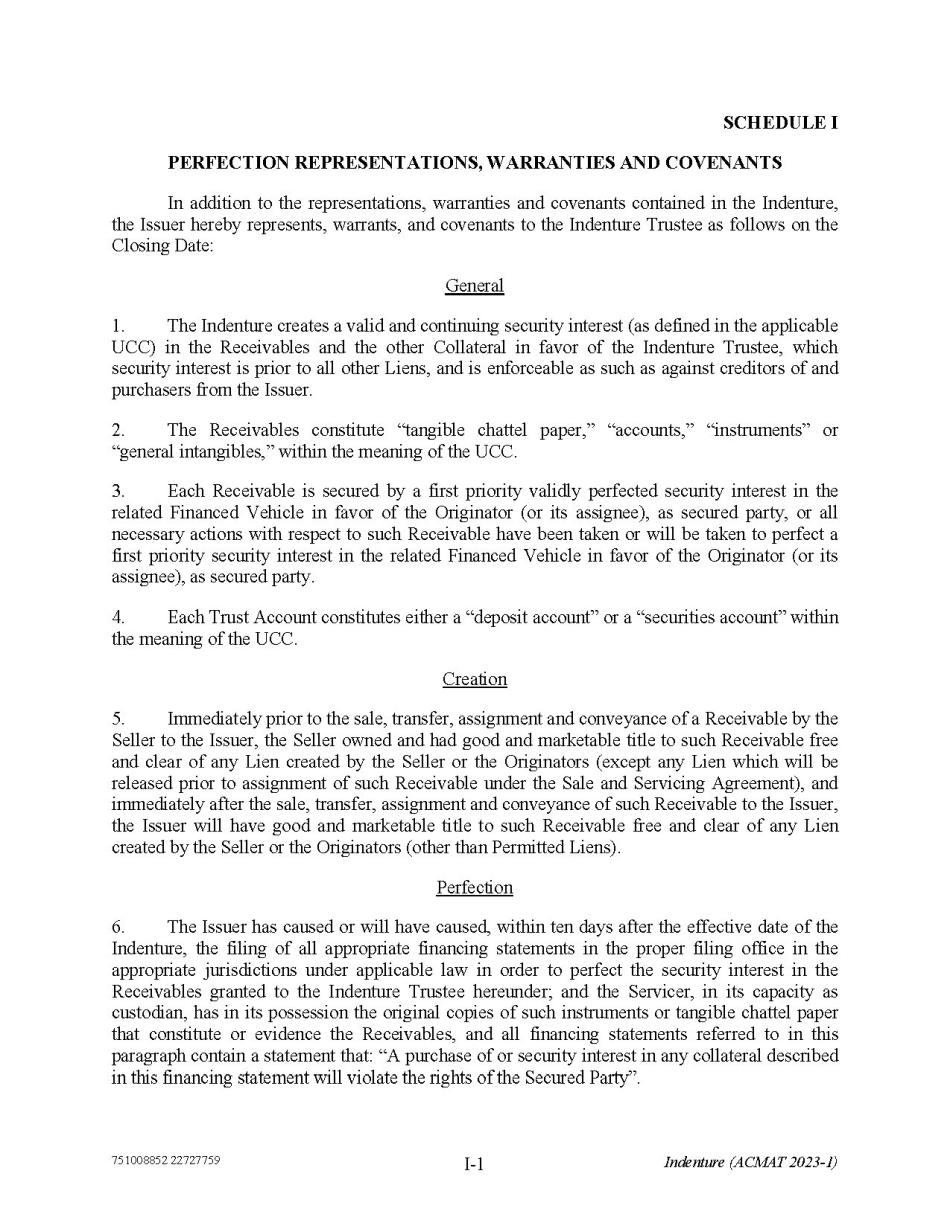 751008852 22727759 I - 1 Indenture (ACMAT 2023 - 1) SCHEDULE I PERFECTION REPRESENTATIONS, WARRANTIES AND COVENANTS In addition to the representations, warranties and covenants contained in the Indenture, the Issuer hereby represents, warrants, and covenants to the Indenture Trustee as follows on the Closing Date : General 1. The Indenture creates a valid and continuing security interest (as defined in the applicable UCC) in the Receivables and the other Collateral in favor of the Indenture Trustee, which security interest is prior to all other Liens, and is enforceable as such as against creditors of and purchasers from the Issuer . 2. The Receivables constitute “tangible chattel paper,” “accounts,” “instruments” or “general intangibles,” within the meaning of the UCC . 3. Each Receivable is secured by a first priority validly perfected security interest in the related Financed Vehicle in favor of the Originator (or its assignee), as secured party, or all necessary actions with respect to such Receivable have been taken or will be taken to perfect a first priority security interest in the related Financed Vehicle in favor of the Originator (or its assignee), as secured party . 4. Each Trust Account constitutes either a “deposit account” or a “securities account” within the meaning of the UCC . Creation 5. Immediately prior to the sale, transfer, assignment and conveyance of a Receivable by the Seller to the Issuer, the Seller owned and had good and marketable title to such Receivable free and clear of any Lien created by the Seller or the Originators (except any Lien which will be released prior to assignment of such Receivable under the Sale and Servicing Agreement), and immediately after the sale, transfer, assignment and conveyance of such Receivable to the Issuer, the Issuer will have good and marketable title to such Receivable free and clear of any Lien created by the Seller or the Originators (other than Permitted Liens) . Perfection 6. The Issuer has caused or will have caused, within ten days after the effective date of the Indenture, the filing of all appropriate financing statements in the proper filing office in the appropriate jurisdictions under applicable law in order to perfect the security interest in the Receivables granted to the Indenture Trustee hereunder ; and the Servicer, in its capacity as custodian, has in its possession the original copies of such instruments or tangible chattel paper that constitute or evidence the Receivables, and all financing statements referred to in this paragraph contain a statement that : “A purchase of or security interest in any collateral described in this financing statement will violate the rights of the Secured Party” .