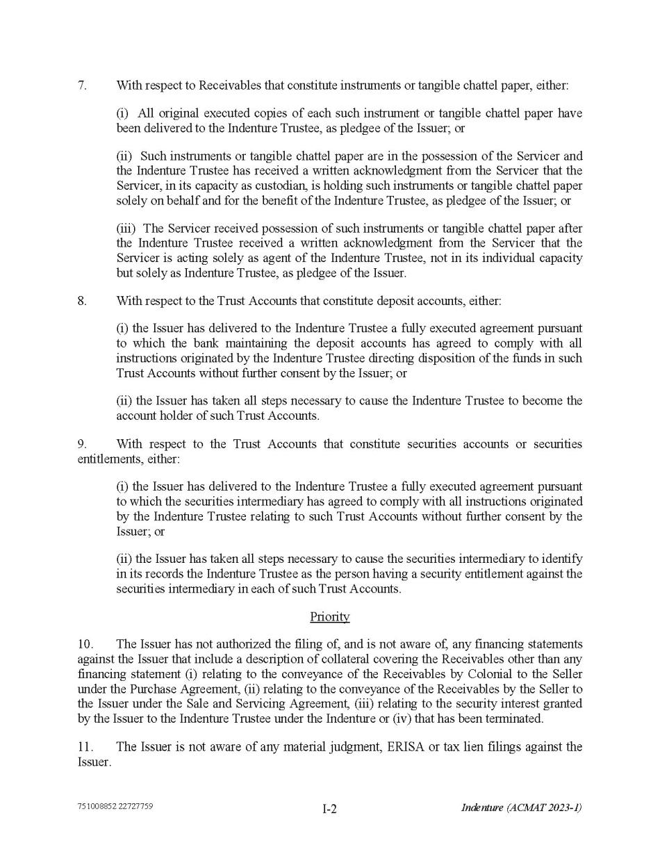 751008852 22727759 I - 2 Indenture (ACMAT 2023 - 1) 7. With respect to Receivables that constitute instruments or tangible chattel paper, either: (i) All original executed copies of each such instrument or tangible chattel paper have been delivered to the Indenture Trustee, as pledgee of the Issuer ; or (ii) Such instruments or tangible chattel paper are in the possession of the Servicer and the Indenture Trustee has received a written acknowledgment from the Servicer that the Servicer, in its capacity as custodian, is holding such instruments or tangible chattel paper solely on behalf and for the benefit of the Indenture Trustee, as pledgee of the Issuer ; or (iii) The Servicer received possession of such instruments or tangible chattel paper after the Indenture Trustee received a written acknowledgment from the Servicer that the Servicer is acting solely as agent of the Indenture Trustee, not in its individual capacity but solely as Indenture Trustee, as pledgee of the Issuer . 8. With respect to the Trust Accounts that constitute deposit accounts, either: (i) the Issuer has delivered to the Indenture Trustee a fully executed agreement pursuant to which the bank maintaining the deposit accounts has agreed to comply with all instructions originated by the Indenture Trustee directing disposition of the funds in such Trust Accounts without further consent by the Issuer ; or (ii) the Issuer has taken all steps necessary to cause the Indenture Trustee to become the account holder of such Trust Accounts . 9. With respect to the Trust Accounts that constitute securities accounts or securities entitlements, either : (i) the Issuer has delivered to the Indenture Trustee a fully executed agreement pursuant to which the securities intermediary has agreed to comply with all instructions originated by the Indenture Trustee relating to such Trust Accounts without further consent by the Issuer ; or (ii) the Issuer has taken all steps necessary to cause the securities intermediary to identify in its records the Indenture Trustee as the person having a security entitlement against the securities intermediary in each of such Trust Accounts . Priority 10. The Issuer has not authorized the filing of, and is not aware of, any financing statements against the Issuer that include a description of collateral covering the Receivables other than any financing statement (i) relating to the conveyance of the Receivables by Colonial to the Seller under the Purchase Agreement, (ii) relating to the conveyance of the Receivables by the Seller to the Issuer under the Sale and Servicing Agreement, (iii) relating to the security interest granted by the Issuer to the Indenture Trustee under the Indenture or (iv) that has been terminated . 11. The Issuer is not aware of any material judgment, ERISA or tax lien filings against the Issuer .