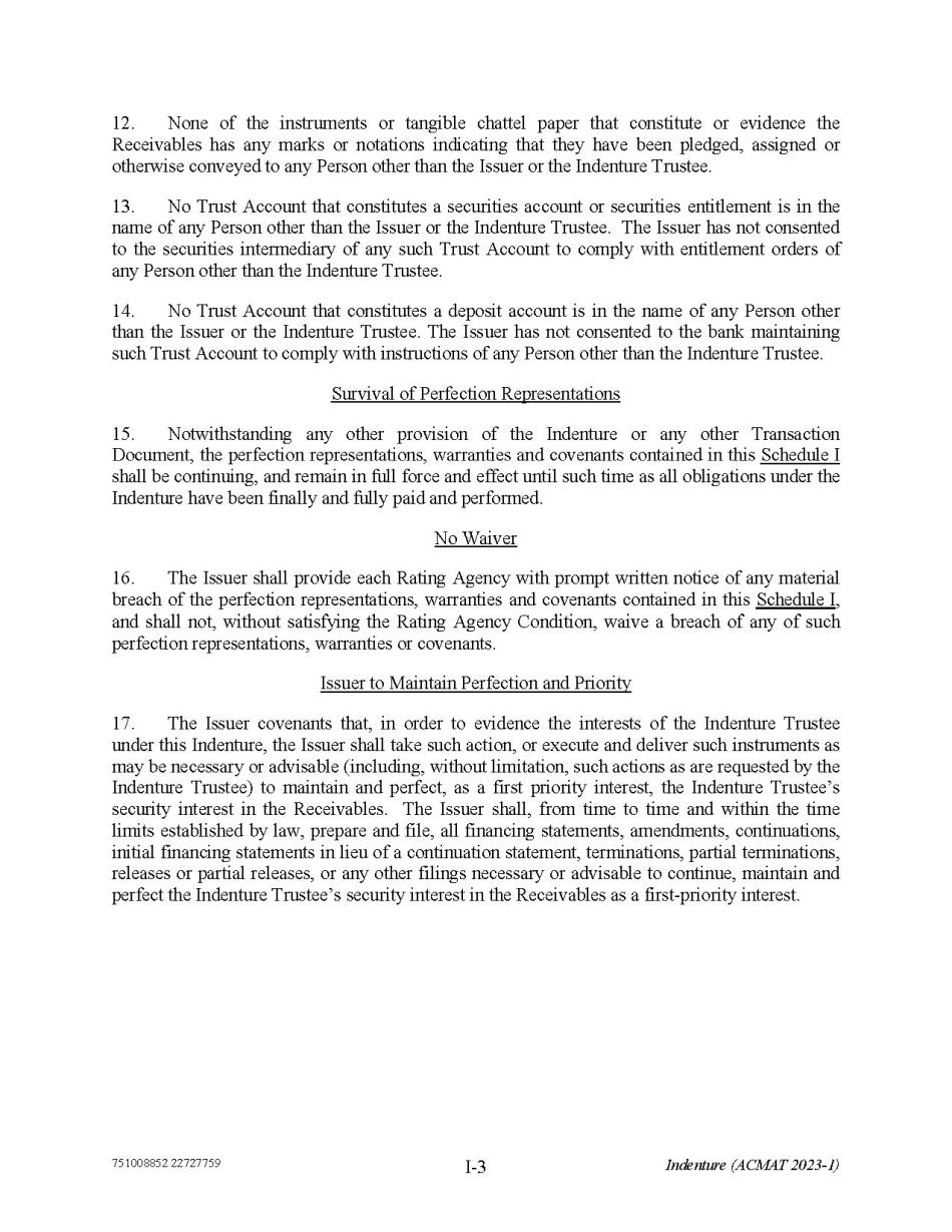 751008852 22727759 I - 3 Indenture (ACMAT 2023 - 1) 12. None of the instruments or tangible chattel paper that constitute or evidence the Receivables has any marks or notations indicating that they have been pledged, assigned or otherwise conveyed to any Person other than the Issuer or the Indenture Trustee . 13. No Trust Account that constitutes a securities account or securities entitlement is in the name of any Person other than the Issuer or the Indenture Trustee . The Issuer has not consented to the securities intermediary of any such Trust Account to comply with entitlement orders of any Person other than the Indenture Trustee . 14. No Trust Account that constitutes a deposit account is in the name of any Person other than the Issuer or the Indenture Trustee . The Issuer has not consented to the bank maintaining such Trust Account to comply with instructions of any Person other than the Indenture Trustee . Survival of Perfection Representations 15. Notwithstanding any other provision of the Indenture or any other Transaction Document, the perfection representations, warranties and covenants contained in this Schedule I shall be continuing, and remain in full force and effect until such time as all obligations under the Indenture have been finally and fully paid and performed . No Waiver 16. The Issuer shall provide each Rating Agency with prompt written notice of any material breach of the perfection representations, warranties and covenants contained in this Schedule I , and shall not, without satisfying the Rating Agency Condition, waive a breach of any of such perfection representations, warranties or covenants . Issuer to Maintain Perfection and Priority 17. The Issuer covenants that, in order to evidence the interests of the Indenture Trustee under this Indenture, the Issuer shall take such action, or execute and deliver such instruments as may be necessary or advisable (including, without limitation, such actions as are requested by the Indenture Trustee) to maintain and perfect, as a first priority interest, the Indenture Trustee’s security interest in the Receivables . The Issuer shall, from time to time and within the time limits established by law, prepare and file, all financing statements, amendments, continuations, initial financing statements in lieu of a continuation statement, terminations, partial terminations, releases or partial releases, or any other filings necessary or advisable to continue, maintain and perfect the Indenture Trustee’s security interest in the Receivables as a first - priority interest .