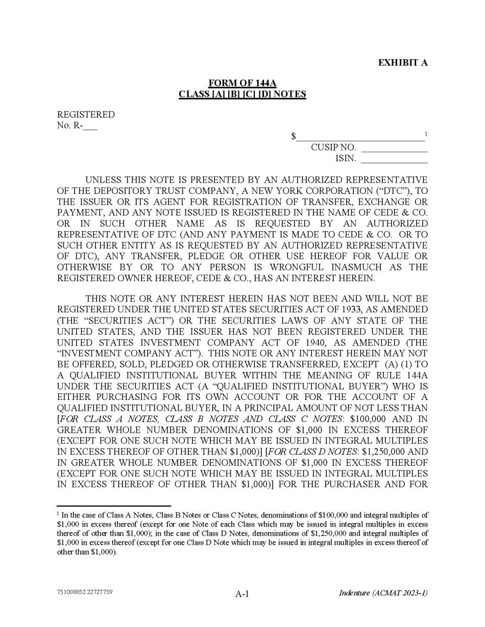 EXHIBIT A FORM OF 144A CLASS [A] [B] [C] [D] NOTES REGISTERED No. R - $ 1 CUSIP NO. ISIN. UNLESS THIS NOTE IS PRESENTED BY AN AUTHORIZED REPRESENTATIVE OF THE DEPOSITORY TRUST COMPANY, A NEW YORK CORPORATION (“DTC”), TO THE ISSUER OR ITS AGENT FOR REGISTRATION OF TRANSFER, EXCHANGE OR PAYMENT, AND ANY NOTE ISSUED IS REGISTERED IN THE NAME OF CEDE & CO . OR IN SUCH OTHER NAME AS IS REQUESTED BY AN AUTHORIZED REPRESENTATIVE OF DTC (AND ANY PAYMENT IS MADE TO CEDE & CO . OR TO SUCH OTHER ENTITY AS IS REQUESTED BY AN AUTHORIZED REPRESENTATIVE OF DTC), ANY TRANSFER, PLEDGE OR OTHER USE HEREOF FOR VALUE OR OTHERWISE BY OR TO ANY PERSON IS WRONGFUL INASMUCH AS THE REGISTERED OWNER HEREOF, CEDE & CO . , HAS AN INTEREST HEREIN . THIS NOTE OR ANY INTEREST HEREIN HAS NOT BEEN AND WILL NOT BE REGISTERED UNDER THE UNITED STATES SECURITIES ACT OF 1933 , AS AMENDED (THE “SECURITIES ACT”) OR THE SECURITIES LAWS OF ANY STATE OF THE UNITED STATES, AND THE ISSUER HAS NOT BEEN REGISTERED UNDER THE UNITED STATES INVESTMENT COMPANY ACT OF 1940 , AS AMENDED (THE “INVESTMENT COMPANY ACT”) . THIS NOTE OR ANY INTEREST HEREIN MAY NOT BE OFFERED, SOLD, PLEDGED OR OTHERWISE TRANSFERRED, EXCEPT (A) ( 1 ) TO A QUALIFIED INSTITUTIONAL BUYER WITHIN THE MEANING OF RULE 144 A UNDER THE SECURITIES ACT (A “QUALIFIED INSTITUTIONAL BUYER”) WHO IS EITHER PURCHASING FOR ITS OWN ACCOUNT OR FOR THE ACCOUNT OF A QUALIFIED INSTITUTIONAL BUYER, IN A PRINCIPAL AMOUNT OF NOT LESS THAN [ FOR CLASS A NOTES, CLASS B NOTES AND CLASS C NOTES : $ 100 , 000 AND IN GREATER WHOLE NUMBER DENOMINATIONS OF $ 1 , 000 IN EXCESS THEREOF (EXCEPT FOR ONE SUCH NOTE WHICH MAY BE ISSUED IN INTEGRAL MULTIPLES IN EXCESS THEREOF OF OTHER THAN $ 1 , 000 )] [ FOR CLASS D NOTES : $ 1 , 250 , 000 AND IN GREATER WHOLE NUMBER DENOMINATIONS OF $ 1 , 000 IN EXCESS THEREOF (EXCEPT FOR ONE SUCH NOTE WHICH MAY BE ISSUED IN INTEGRAL MULTIPLES IN EXCESS THEREOF OF OTHER THAN $ 1 , 000 )] FOR THE PURCHASER AND FOR 1 In the case of Class A Notes, Class B Notes or Class C Notes, denominations of $100,000 and integral multiples of $1,000 in excess thereof (except for one Note of each Class which may be issued in integral multiples in excess thereof of other than $1,000); in the case of Class D Notes, denominations of $1,250,000 and integral multiples of $1,000 in excess thereof (except for one Class D Note which may be issued in integral multiples in excess thereof of other than $1,000). 751008852 22727759 A - 1 Indenture (ACMAT 2023 - 1)