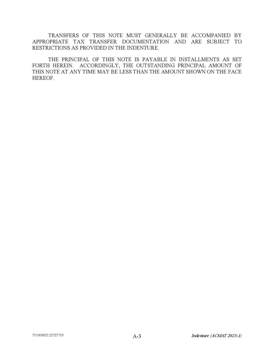 751008852 22727759 A - 3 Indenture (ACMAT 2023 - 1) TRANSFERS OF THIS NOTE MUST GENERALLY BE ACCOMPANIED BY APPROPRIATE TAX TRANSFER DOCUMENTATION AND ARE SUBJECT TO RESTRICTIONS AS PROVIDED IN THE INDENTURE . THE PRINCIPAL OF THIS NOTE IS PAYABLE IN INSTALLMENTS AS SET FORTH HEREIN . ACCORDINGLY, THE OUTSTANDING PRINCIPAL AMOUNT OF THIS NOTE AT ANY TIME MAY BE LESS THAN THE AMOUNT SHOWN ON THE FACE HEREOF .