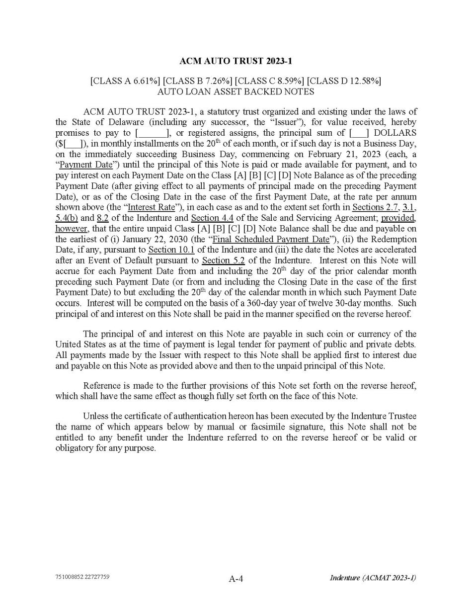 751008852 22727759 A - 4 Indenture (ACMAT 2023 - 1) ACM AUTO TRUST 2023 - 1 [CLASS A 6.61%] [CLASS B 7.26%] [CLASS C 8.59%] [CLASS D 12.58%] AUTO LOAN ASSET BACKED NOTES ACM AUTO TRUST 2023 - 1 , a statutory trust organized and existing under the laws of the State of Delaware (including any successor, the “Issuer”), for value received, hereby promises to pay to [ ], or registered assigns, the principal sum of [ ] DOLLARS ( $ [ ]), in monthly installments on the 20 th of each month, or if such day is not a Business Day, on the immediately succeeding Business Day, commencing on February 21 , 2023 (each, a “ Payment Date ”) until the principal of this Note is paid or made available for payment, and to pay interest on each Payment Date on the Class [A] [B] [C] [D] Note Balance as of the preceding Payment Date (after giving effect to all payments of principal made on the preceding Payment Date), or as of the Closing Date in the case of the first Payment Date, at the rate per annum shown above (the “ Interest Rate ”), in each case as and to the extent set forth in Sections 2 . 7 , 3 . 1 , 5 . 4 (b) and 8 . 2 of the Indenture and Section 4 . 4 of the Sale and Servicing Agreement ; provided , however , that the entire unpaid Class [A] [B] [C] [D] Note Balance shall be due and payable on the earliest of (i) January 22 , 2030 (the “ Final Scheduled Payment Date ”), (ii) the Redemption Date, if any, pursuant to Section 10 . 1 of the Indenture and (iii) the date the Notes are accelerated after an Event of Default pursuant to Section 5 . 2 of the Indenture . Interest on this Note will accrue for each Payment Date from and including the 20 th day of the prior calendar month preceding such Payment Date (or from and including the Closing Date in the case of the first Payment Date) to but excluding the 20 th day of the calendar month in which such Payment Date occurs . Interest will be computed on the basis of a 360 - day year of twelve 30 - day months . Such principal of and interest on this Note shall be paid in the manner specified on the reverse hereof . The principal of and interest on this Note are payable in such coin or currency of the United States as at the time of payment is legal tender for payment of public and private debts . All payments made by the Issuer with respect to this Note shall be applied first to interest due and payable on this Note as provided above and then to the unpaid principal of this Note . Reference is made to the further provisions of this Note set forth on the reverse hereof, which shall have the same effect as though fully set forth on the face of this Note . Unless the certificate of authentication hereon has been executed by the Indenture Trustee the name of which appears below by manual or facsimile signature, this Note shall not be entitled to any benefit under the Indenture referred to on the reverse hereof or be valid or obligatory for any purpose .