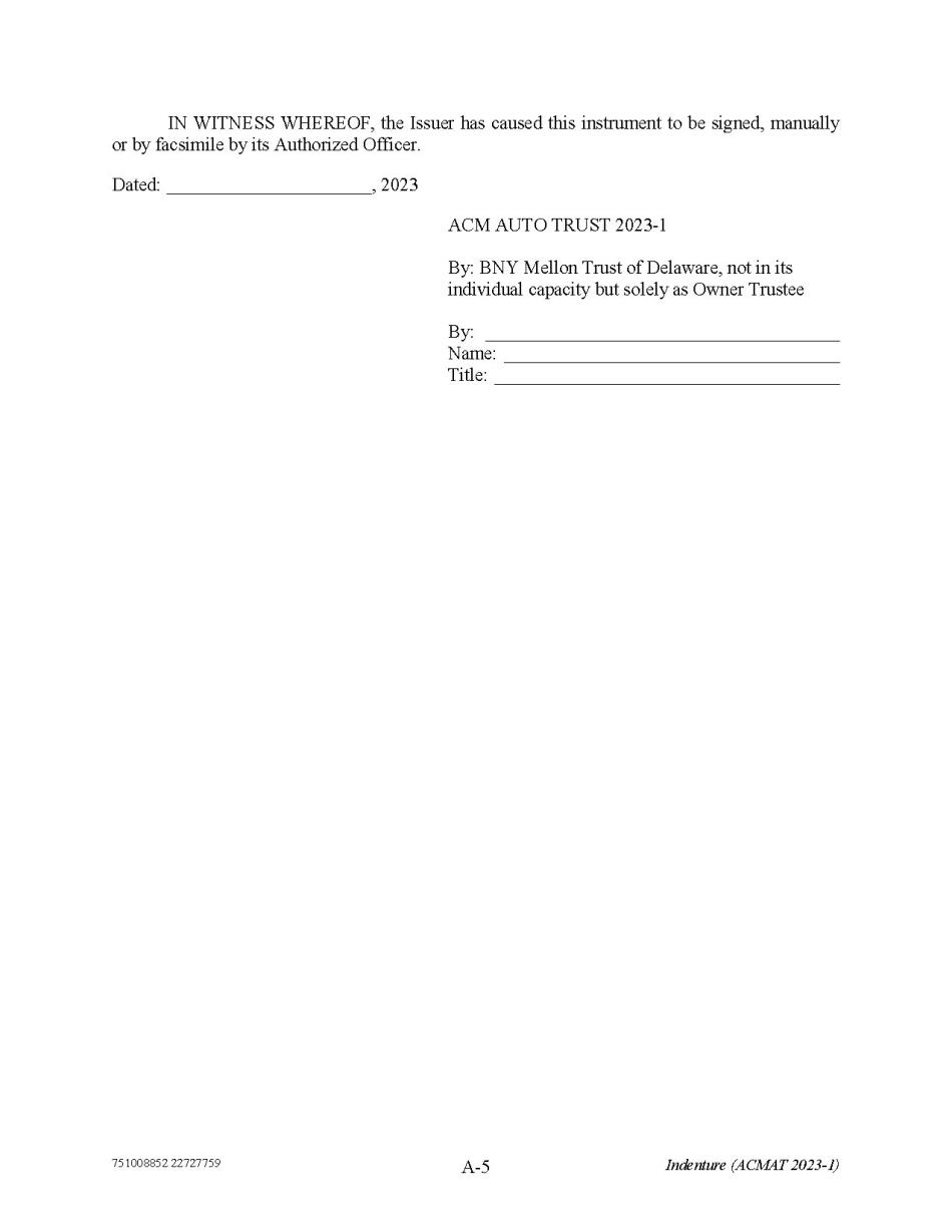 751008852 22727759 A - 5 Indenture (ACMAT 2023 - 1) IN WITNESS WHEREOF, the Issuer has caused this instrument to be signed, manually or by facsimile by its Authorized Officer. Dated: , 2023 ACM AUTO TRUST 2023 - 1 By: BNY Mellon Trust of Delaware, not in its individual capacity but solely as Owner Trustee By : Name : Title :