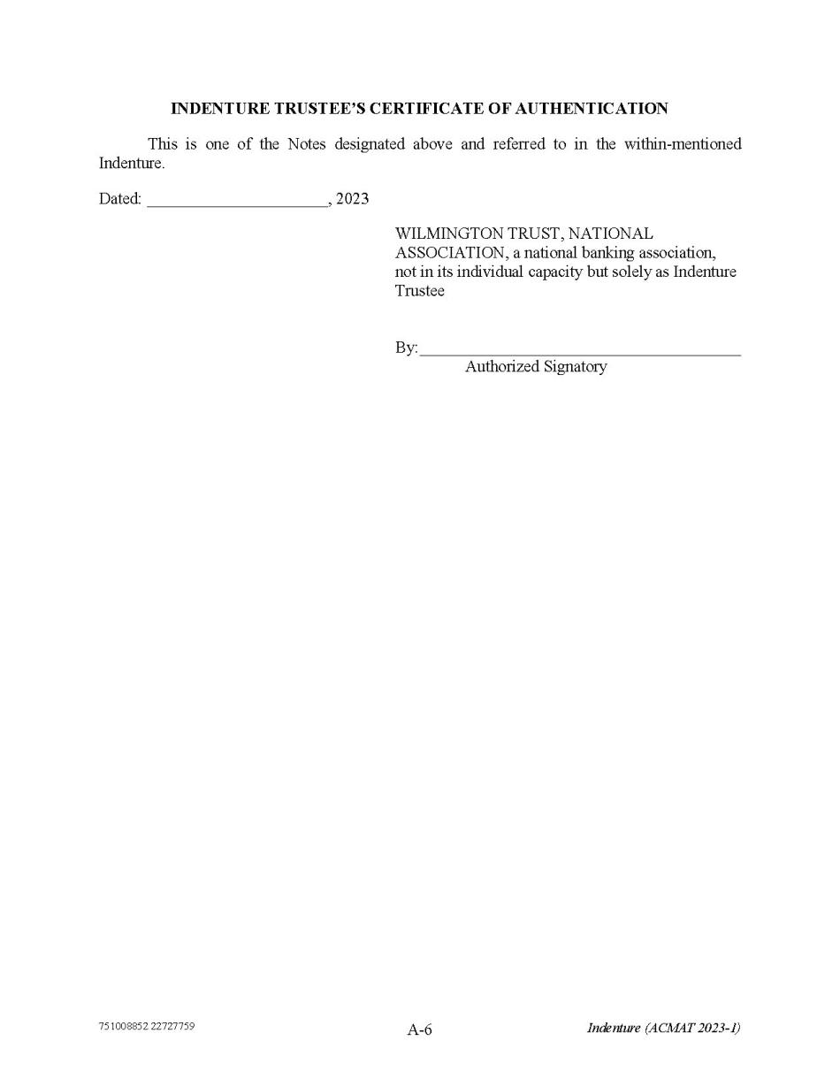 751008852 22727759 A - 6 Indenture (ACMAT 2023 - 1) INDENTURE TRUSTEE’S CERTIFICATE OF AUTHENTICATION This is one of the Notes designated above and referred to in the within - mentioned Indenture. Dated: , 2023 WILMINGTON TRUST, NATIONAL ASSOCIATION, a national banking association, not in its individual capacity but solely as Indenture Trustee By: Authorized Signatory
