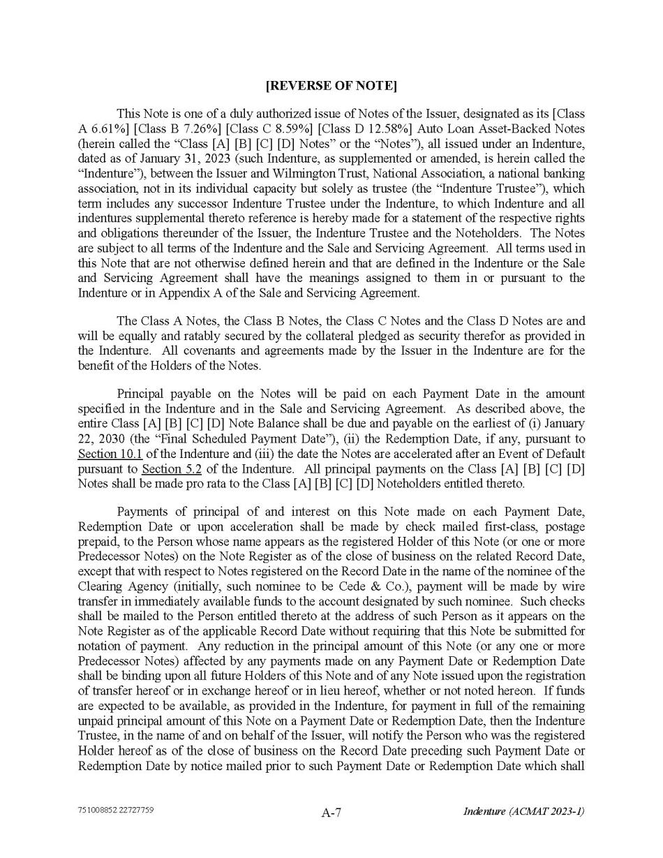 751008852 22727759 A - 7 Indenture (ACMAT 2023 - 1) [REVERSE OF NOTE] This Note is one of a duly authorized issue of Notes of the Issuer, designated as its [Class A 6 . 61 % ] [Class B 7 . 26 % ] [Class C 8 . 59 % ] [Class D 12 . 58 % ] Auto Loan Asset - Backed Notes (herein called the “Class [A] [B] [C] [D] Notes” or the “Notes”), all issued under an Indenture, dated as of January 31 , 2023 (such Indenture, as supplemented or amended, is herein called the “Indenture”), between the Issuer and Wilmington Trust, National Association, a national banking association, not in its individual capacity but solely as trustee (the “Indenture Trustee”), which term includes any successor Indenture Trustee under the Indenture, to which Indenture and all indentures supplemental thereto reference is hereby made for a statement of the respective rights and obligations thereunder of the Issuer, the Indenture Trustee and the Noteholders . The Notes are subject to all terms of the Indenture and the Sale and Servicing Agreement . All terms used in this Note that are not otherwise defined herein and that are defined in the Indenture or the Sale and Servicing Agreement shall have the meanings assigned to them in or pursuant to the Indenture or in Appendix A of the Sale and Servicing Agreement . The Class A Notes, the Class B Notes, the Class C Notes and the Class D Notes are and will be equally and ratably secured by the collateral pledged as security therefor as provided in the Indenture . All covenants and agreements made by the Issuer in the Indenture are for the benefit of the Holders of the Notes . Principal payable on the Notes will be paid on each Payment Date in the amount specified in the Indenture and in the Sale and Servicing Agreement . As described above, the entire Class [A] [B] [C] [D] Note Balance shall be due and payable on the earliest of (i) January 22 , 2030 (the “Final Scheduled Payment Date”), (ii) the Redemption Date, if any, pursuant to Section 10 . 1 of the Indenture and (iii) the date the Notes are accelerated after an Event of Default pursuant to Section 5 . 2 of the Indenture . All principal payments on the Class [A] [B] [C] [D] Notes shall be made pro rata to the Class [A] [B] [C] [D] Noteholders entitled thereto . Payments of principal of and interest on this Note made on each Payment Date, Redemption Date or upon acceleration shall be made by check mailed first - class, postage prepaid, to the Person whose name appears as the registered Holder of this Note (or one or more Predecessor Notes) on the Note Register as of the close of business on the related Record Date, except that with respect to Notes registered on the Record Date in the name of the nominee of the Clearing Agency (initially, such nominee to be Cede & Co . ), payment will be made by wire transfer in immediately available funds to the account designated by such nominee . Such checks shall be mailed to the Person entitled thereto at the address of such Person as it appears on the Note Register as of the applicable Record Date without requiring that this Note be submitted for notation of payment . Any reduction in the principal amount of this Note (or any one or more Predecessor Notes) affected by any payments made on any Payment Date or Redemption Date shall be binding upon all future Holders of this Note and of any Note issued upon the registration of transfer hereof or in exchange hereof or in lieu hereof, whether or not noted hereon . If funds are expected to be available, as provided in the Indenture, for payment in full of the remaining unpaid principal amount of this Note on a Payment Date or Redemption Date, then the Indenture Trustee, in the name of and on behalf of the Issuer, will notify the Person who was the registered Holder hereof as of the close of business on the Record Date preceding such Payment Date or Redemption Date by notice mailed prior to such Payment Date or Redemption Date which shall