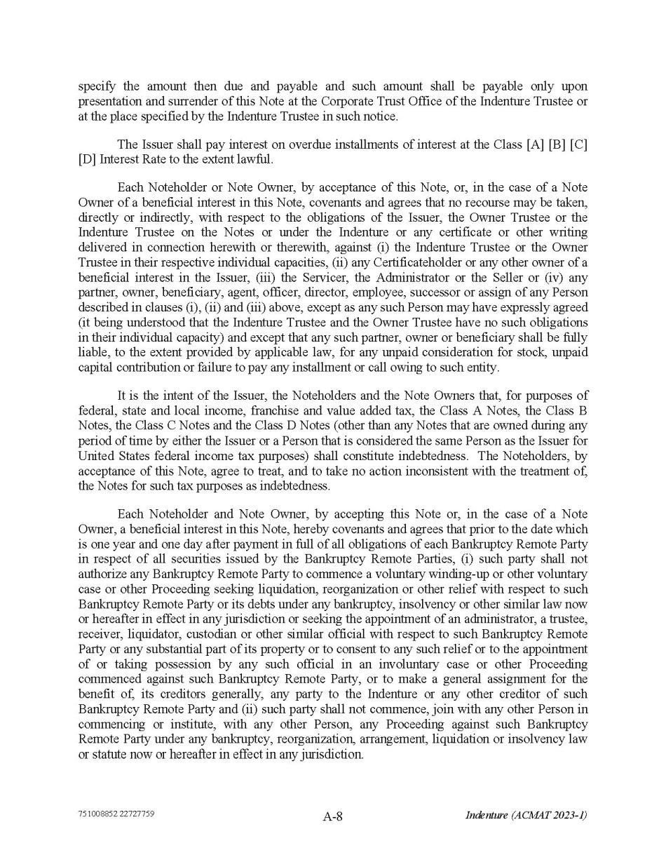 751008852 22727759 A - 8 Indenture (ACMAT 2023 - 1) specify the amount then due and payable and such amount shall be payable only upon presentation and surrender of this Note at the Corporate Trust Office of the Indenture Trustee or at the place specified by the Indenture Trustee in such notice . The Issuer shall pay interest on overdue installments of interest at the Class [A] [B] [C] [D] Interest Rate to the extent lawful. Each Noteholder or Note Owner, by acceptance of this Note, or, in the case of a Note Owner of a beneficial interest in this Note, covenants and agrees that no recourse may be taken, directly or indirectly, with respect to the obligations of the Issuer, the Owner Trustee or the Indenture Trustee on the Notes or under the Indenture or any certificate or other writing delivered in connection herewith or therewith, against (i) the Indenture Trustee or the Owner Trustee in their respective individual capacities, (ii) any Certificateholder or any other owner of a beneficial interest in the Issuer, (iii) the Servicer, the Administrator or the Seller or (iv) any partner, owner, beneficiary, agent, officer, director, employee, successor or assign of any Person described in clauses (i), (ii) and (iii) above, except as any such Person may have expressly agreed (it being understood that the Indenture Trustee and the Owner Trustee have no such obligations in their individual capacity) and except that any such partner, owner or beneficiary shall be fully liable, to the extent provided by applicable law, for any unpaid consideration for stock, unpaid capital contribution or failure to pay any installment or call owing to such entity . It is the intent of the Issuer, the Noteholders and the Note Owners that, for purposes of federal, state and local income, franchise and value added tax, the Class A Notes, the Class B Notes, the Class C Notes and the Class D Notes (other than any Notes that are owned during any period of time by either the Issuer or a Person that is considered the same Person as the Issuer for United States federal income tax purposes) shall constitute indebtedness . The Noteholders, by acceptance of this Note, agree to treat, and to take no action inconsistent with the treatment of, the Notes for such tax purposes as indebtedness . Each Noteholder and Note Owner, by accepting this Note or, in the case of a Note Owner, a beneficial interest in this Note, hereby covenants and agrees that prior to the date which is one year and one day after payment in full of all obligations of each Bankruptcy Remote Party in respect of all securities issued by the Bankruptcy Remote Parties, (i) such party shall not authorize any Bankruptcy Remote Party to commence a voluntary winding - up or other voluntary case or other Proceeding seeking liquidation, reorganization or other relief with respect to such Bankruptcy Remote Party or its debts under any bankruptcy, insolvency or other similar law now or hereafter in effect in any jurisdiction or seeking the appointment of an administrator, a trustee, receiver, liquidator, custodian or other similar official with respect to such Bankruptcy Remote Party or any substantial part of its property or to consent to any such relief or to the appointment of or taking possession by any such official in an involuntary case or other Proceeding commenced against such Bankruptcy Remote Party, or to make a general assignment for the benefit of, its creditors generally, any party to the Indenture or any other creditor of such Bankruptcy Remote Party and (ii) such party shall not commence, join with any other Person in commencing or institute, with any other Person, any Proceeding against such Bankruptcy Remote Party under any bankruptcy, reorganization, arrangement, liquidation or insolvency law or statute now or hereafter in effect in any jurisdiction .