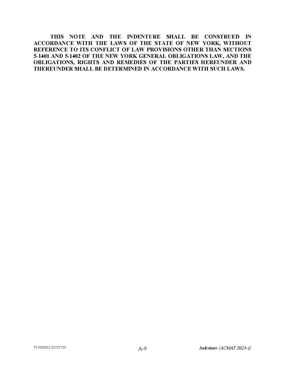 751008852 22727759 A - 9 Indenture (ACMAT 2023 - 1) THIS NOTE AND THE INDENTURE SHALL BE CONSTRUED IN ACCORDANCE WITH THE LAWS OF THE STATE OF NEW YORK, WITHOUT REFERENCE TO ITS CONFLICT OF LAW PROVISIONS OTHER THAN SECTIONS 5 - 1401 AND 5 - 1402 OF THE NEW YORK GENERAL OBLIGATIONS LAW, AND THE OBLIGATIONS, RIGHTS AND REMEDIES OF THE PARTIES HEREUNDER AND THEREUNDER SHALL BE DETERMINED IN ACCORDANCE WITH SUCH LAWS .