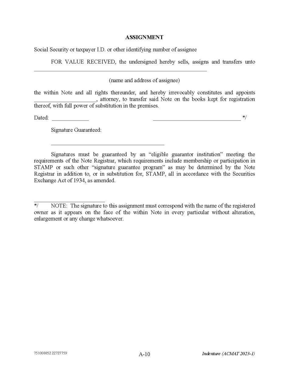 ASSIGNMENT Social Security or taxpayer I.D. or other identifying number of assignee FOR VALUE RECEIVED, the undersigned hereby sells, assigns and transfers unto (name and address of assignee) the within Note and all rights thereunder, and hereby irrevocably constitutes and appoints , attorney, to transfer said Note on the books kept for registration thereof, with full power of substitution in the premises. Dated: */ Signature Guaranteed: Signatures must be guaranteed by an “eligible guarantor institution” meeting the requirements of the Note Registrar, which requirements include membership or participation in STAMP or such other “signature guarantee program” as may be determined by the Note Registrar in addition to, or in substitution for, STAMP, all in accordance with the Securities Exchange Act of 1934 , as amended . */ NOTE : The signature to this assignment must correspond with the name of the registered owner as it appears on the face of the within Note in every particular without alteration, enlargement or any change whatsoever . 751008852 22727759 A - 10 Indenture (ACMAT 2023 - 1)