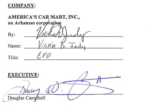 This Amended and Restated Employment Agreement (the “Agreement”) is entered into by and between AMERICA’S CAR MART, INC., an Arkansas corporation (the “Company”) and DOUGLAS CAMPBELL (the “Executive”) (together, the “Parties”), on December 19, 2023 (the “Signing Date”) to be effective as of October 1, 2023 (the “Effective Date”).