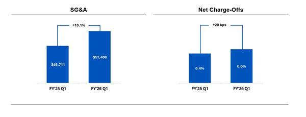 NET CHARGE-OFFS (NCOs) – NCOs as a percentage of average finance receivables were 6.6%, up from 6.4%. The drivers of the percentage increase were related to softer sales (approximately 50%; impacting the denominator) and increases in both the frequency and severity of loss (impacting the numerator). Of the 50% increase, about three-quarters was due to higher frequency, while the remaining one-quarter resulted from increased severity. Delinquencies (30+ days) were 3.8% at the end of the quarter, which represented a 30 basis points increase over the prior year quarter.