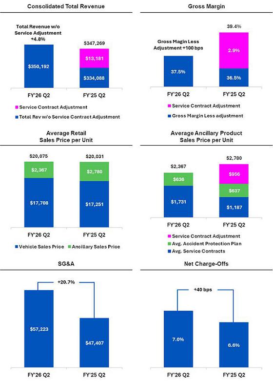 TOTAL REVENUE – Total revenue for the quarter was $350.2 million, an increase of 0.8% year-over-year which included a $13.2 million one-time benefit received last year from a change in service contract revenue recognition. Absent the $13.2 million benefit in the prior year, revenue on an adjusted basis (non-GAAP)1 would have grown 4.8% year-over-year. This growth was driven by 3.9% higher interest income and an increase in the average retail sales price of 2.6% or $457 per unit. The increase in sales price was driven by higher average procurement costs outlined in the prior quarter. The mild increase in sales price was absorbed by the overall higher rated consumers who purchased vehicles during the quarter.