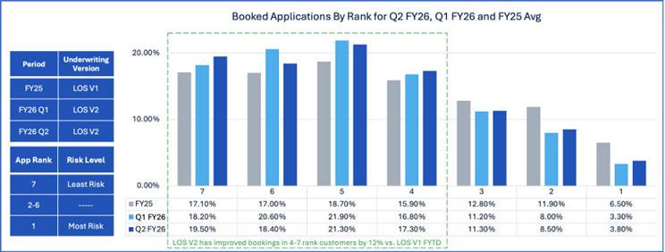 The Company’s underwriting approach remained consistent between the first and second quarters of this fiscal year. The above chart reflects applications booked during the first and second quarter of this fiscal year when compared to all booked applications in fiscal year 2025 on LOS V1. In the second quarter, the Company continued to see a meaningful shift towards the higher ranked customers with over 12% more customers booked in ranks 4-7, which have lower projected probability of loss and stronger expected overall returns.