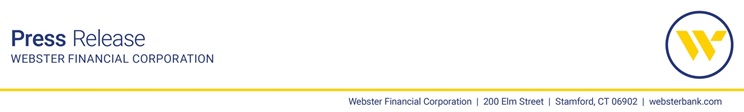 Webster Financial Corporation (NYSE:WBS) is the holding company for Webster Bank, National Association and its HSA Bank division. Webster is a leading commercial bank in the Northeast that provides a wide range of financial solutions across three differentiated lines of business: Commercial Banking, Consumer Banking and its HSA Bank division, one of the country’s largest providers of employee benefits solutions. Headquartered in Stamford, CT, Webster is a values-guided organization with more than $65 billion in assets. Its core footprint spans the northeastern U.S. from New York to Massachusetts, with certain businesses operating in extended geographies. Webster Bank is a member of the FDIC and an equal housing lender.  For more information about Webster, including past press releases and the latest annual report, visit the Webster website at www.websterbank.com.