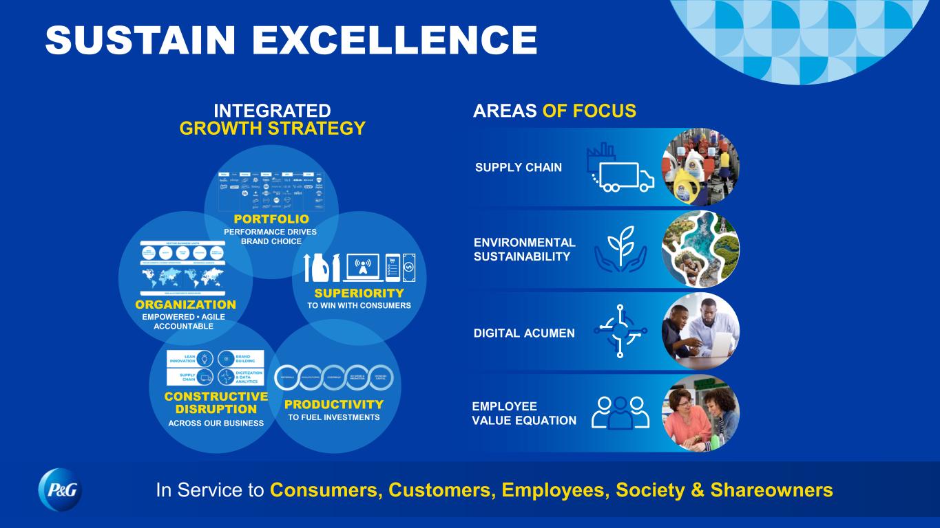 AREAS OF FOCUS EMPLOYEE VALUE EQUATION ENVIRONMENTAL SUSTAINABILITY SUPPLY CHAIN DIGITAL ACUMEN SUSTAIN EXCELLENCE INTEGRATED GROWTH STRATEGY SUPERIORITY TO WIN WITH CONSUMERS PRODUCTIVITY TO FUEL INVESTMENTS ORGANIZATION EMPOWERED • AGILE ACCOUNTABLE PORTFOLIO PERFORMANCE DRIVES BRAND CHOICE CONSTRUCTIVE DISRUPTION ACROSS OUR BUSINESS In Service to Consumers, Customers, Employees, Society & Shareowners
