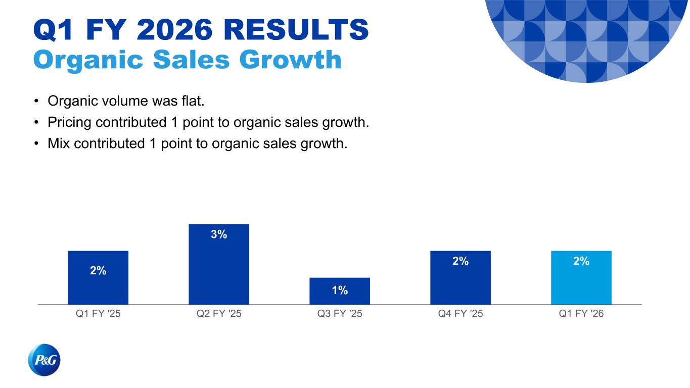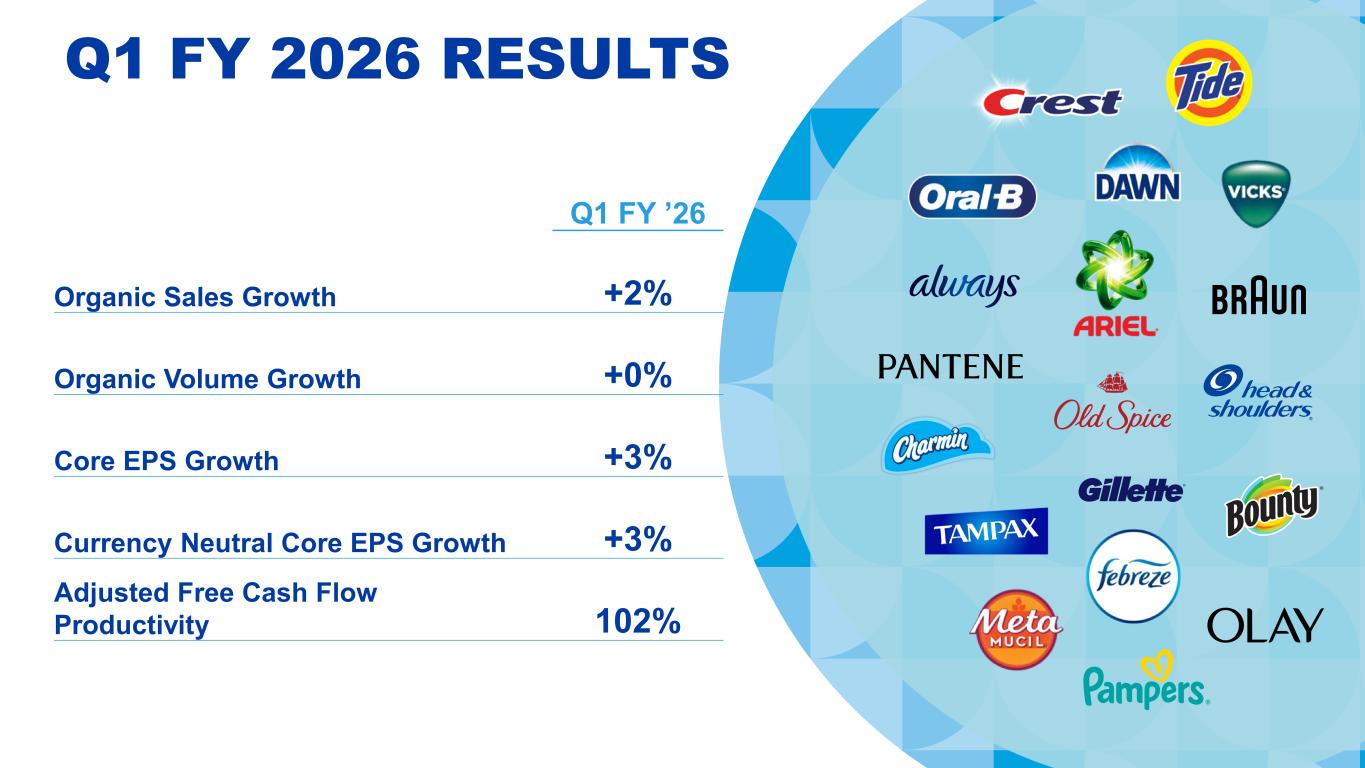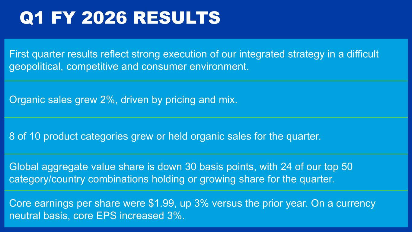 First quarter results reflect strong execution of our integrated strategy in a difficult geopolitical, competitive and consumer environment. Organic sales grew 2%, driven by pricing and mix. 8 of 10 product categories grew or held organic sales for the quarter. Global aggregate value share is down 30 basis points, with 24 of our top 50 category/country combinations holding or growing share for the quarter. Core earnings per share were $1.99, up 3% versus the prior year. On a currency neutral basis, core EPS increased 3%. Q1 FY 2026 RESULTS