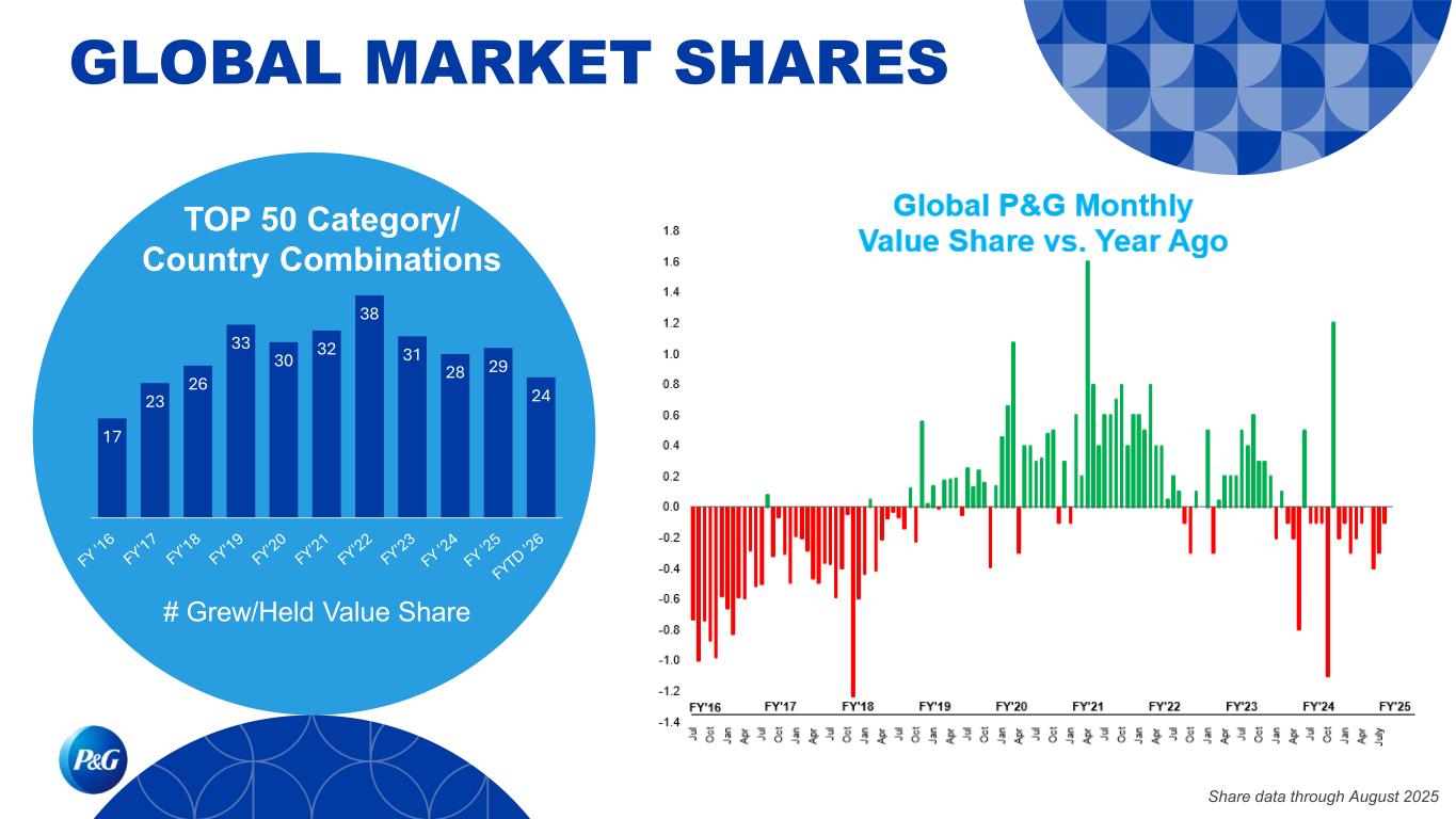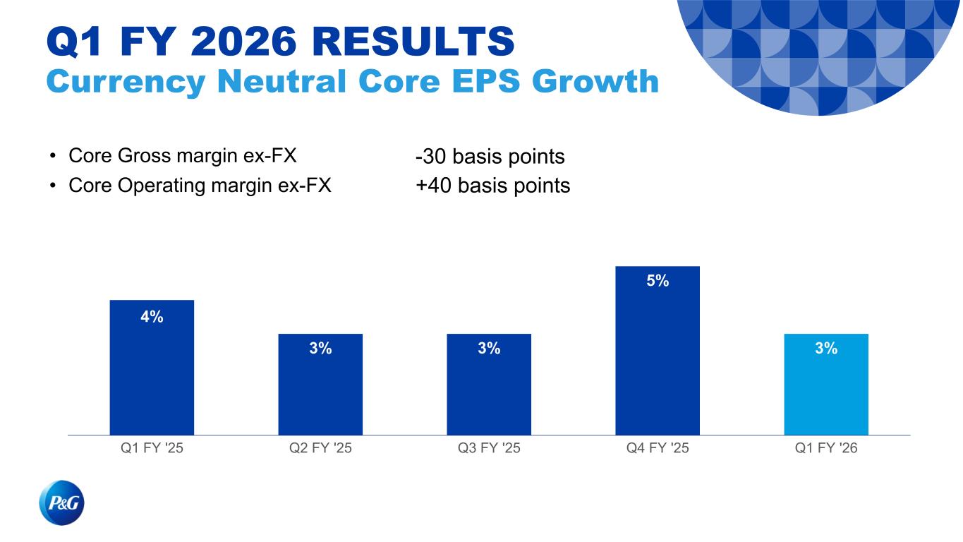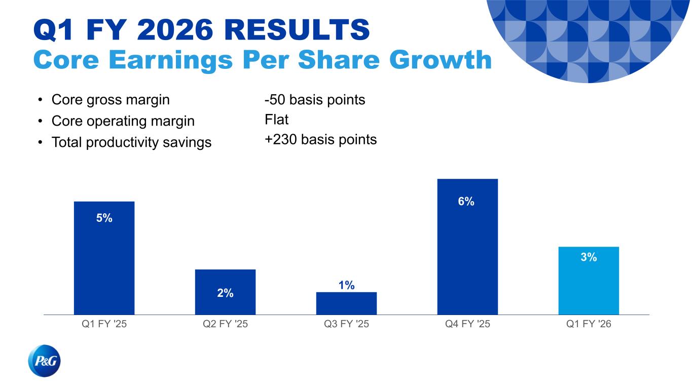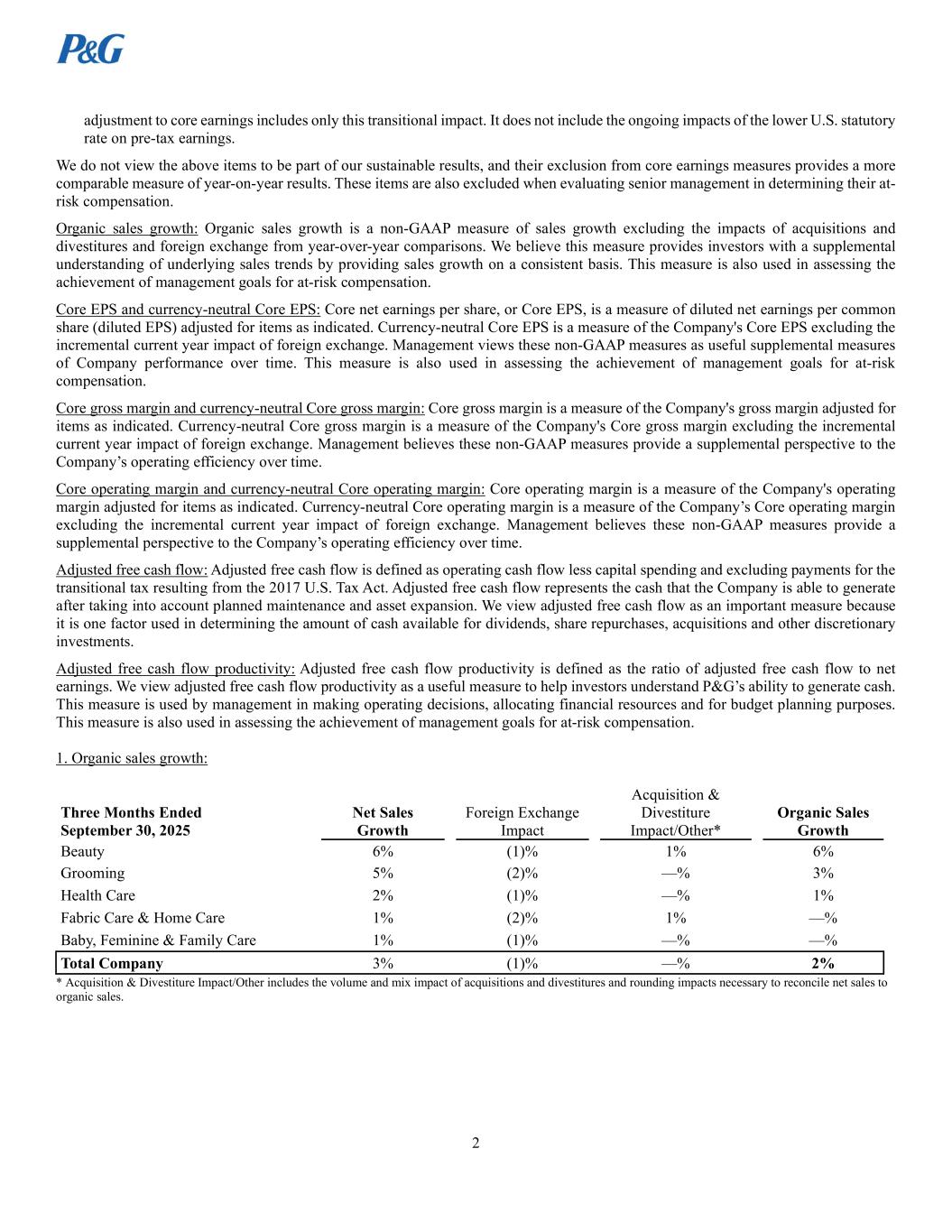 2 adjustment to core earnings includes only this transitional impact. It does not include the ongoing impacts of the lower U.S. statutory rate on pre-tax earnings. We do not view the above items to be part of our sustainable results, and their exclusion from core earnings measures provides a more comparable measure of year-on-year results. These items are also excluded when evaluating senior management in determining their at- risk compensation. Organic sales growth: Organic sales growth is a non-GAAP measure of sales growth excluding the impacts of acquisitions and divestitures and foreign exchange from year-over-year comparisons. We believe this measure provides investors with a supplemental understanding of underlying sales trends by providing sales growth on a consistent basis. This measure is also used in assessing the achievement of management goals for at-risk compensation. Core EPS and currency-neutral Core EPS: Core net earnings per share, or Core EPS, is a measure of diluted net earnings per common share (diluted EPS) adjusted for items as indicated. Currency-neutral Core EPS is a measure of the Company's Core EPS excluding the incremental current year impact of foreign exchange. Management views these non-GAAP measures as useful supplemental measures of Company performance over time. This measure is also used in assessing the achievement of management goals for at-risk compensation. Core gross margin and currency-neutral Core gross margin: Core gross margin is a measure of the Company's gross margin adjusted for items as indicated. Currency-neutral Core gross margin is a measure of the Company's Core gross margin excluding the incremental current year impact of foreign exchange. Management believes these non-GAAP measures provide a supplemental perspective to the Company’s operating efficiency over time. Core operating margin and currency-neutral Core operating margin: Core operating margin is a measure of the Company's operating margin adjusted for items as indicated. Currency-neutral Core operating margin is a measure of the Company’s Core operating margin excluding the incremental current year impact of foreign exchange. Management believes these non-GAAP measures provide a supplemental perspective to the Company’s operating efficiency over time. Adjusted free cash flow: Adjusted free cash flow is defined as operating cash flow less capital spending and excluding payments for the transitional tax resulting from the 2017 U.S. Tax Act. Adjusted free cash flow represents the cash that the Company is able to generate after taking into account planned maintenance and asset expansion. We view adjusted free cash flow as an important measure because it is one factor used in determining the amount of cash available for dividends, share repurchases, acquisitions and other discretionary investments. Adjusted free cash flow productivity: Adjusted free cash flow productivity is defined as the ratio of adjusted free cash flow to net earnings. We view adjusted free cash flow productivity as a useful measure to help investors understand P&G’s ability to generate cash. This measure is used by management in making operating decisions, allocating financial resources and for budget planning purposes. This measure is also used in assessing the achievement of management goals for at-risk compensation. 1. Organic sales growth: Three Months Ended September 30, 2025 Net Sales Growth Foreign Exchange Impact Acquisition & Divestiture Impact/Other* Organic Sales Growth Beauty 6% (1)% 1% 6% Grooming 5% (2)% —% 3% Health Care 2% (1)% —% 1% Fabric Care & Home Care 1% (2)% 1% —% Baby, Feminine & Family Care 1% (1)% —% —% Total Company 3% (1)% —% 2% * Acquisition & Divestiture Impact/Other includes the volume and mix impact of acquisitions and divestitures and rounding impacts necessary to reconcile net sales to organic sales.