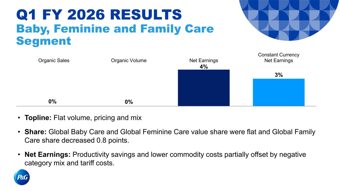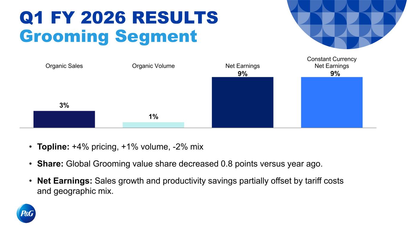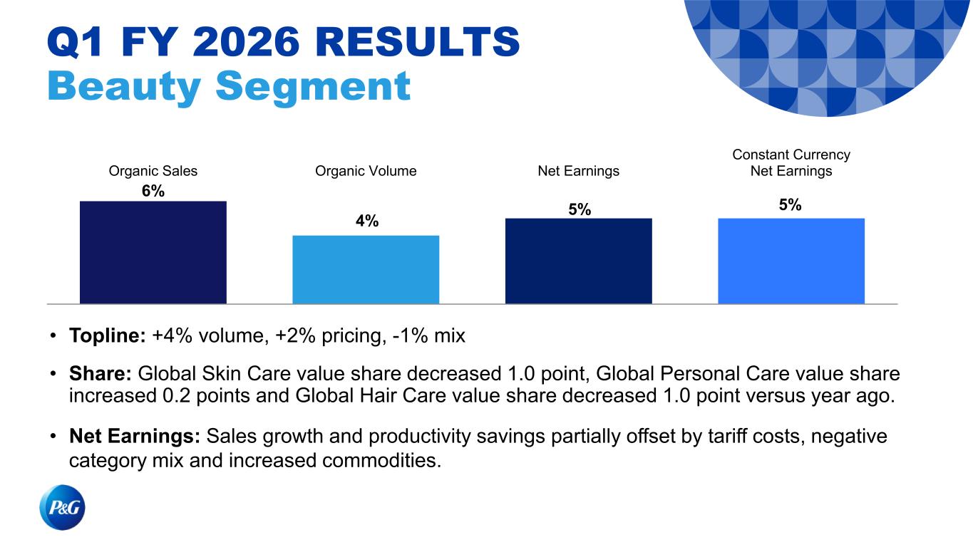 6% 4% 5% 5% Organic Sales Organic Volume Net Earnings Constant Currency Net Earnings • Topline: +4% volume, +2% pricing, -1% mix • Share: Global Skin Care value share decreased 1.0 point, Global Personal Care value share increased 0.2 points and Global Hair Care value share decreased 1.0 point versus year ago. • Net Earnings: Sales growth and productivity savings partially offset by tariff costs, negative category mix and increased commodities. Q1 FY 2026 RESULTS Beauty Segment