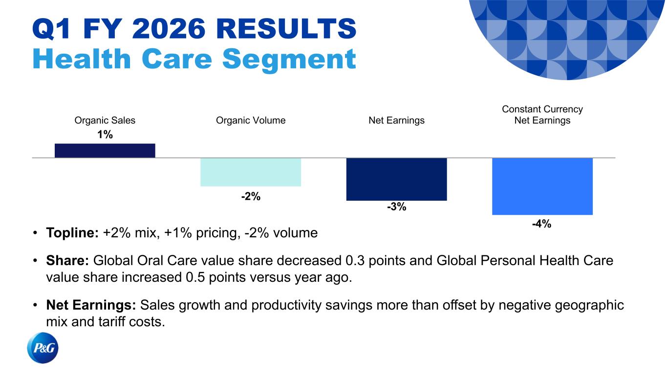 1% -2% -3% -4% Organic Sales Organic Volume Net Earnings Constant Currency Net Earnings • Topline: +2% mix, +1% pricing, -2% volume • Share: Global Oral Care value share decreased 0.3 points and Global Personal Health Care value share increased 0.5 points versus year ago. • Net Earnings: Sales growth and productivity savings more than offset by negative geographic mix and tariff costs. Q1 FY 2026 RESULTS Health Care Segment