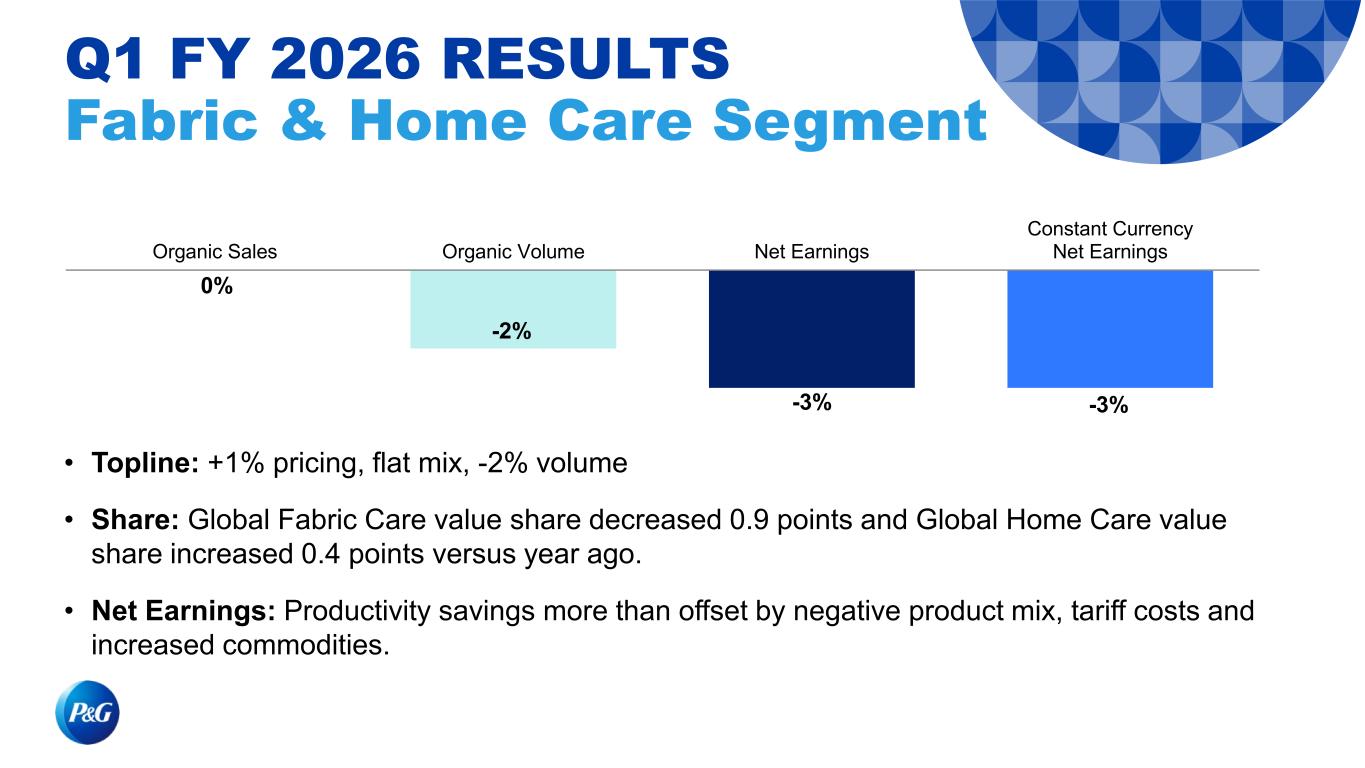 0% -2% -3% -3% Organic Sales Organic Volume Net Earnings Constant Currency Net Earnings • Topline: +1% pricing, flat mix, -2% volume • Share: Global Fabric Care value share decreased 0.9 points and Global Home Care value share increased 0.4 points versus year ago. • Net Earnings: Productivity savings more than offset by negative product mix, tariff costs and increased commodities. Q1 FY 2026 RESULTS Fabric & Home Care Segment