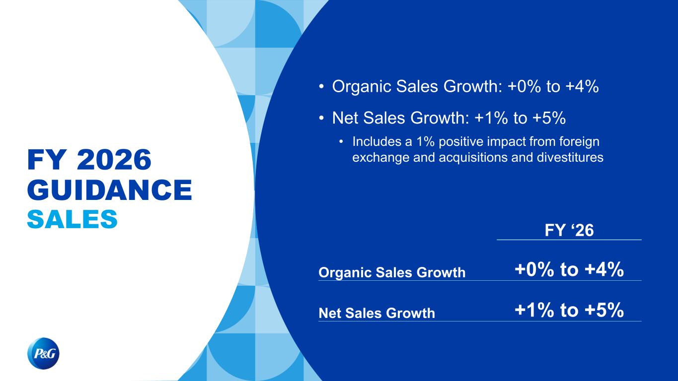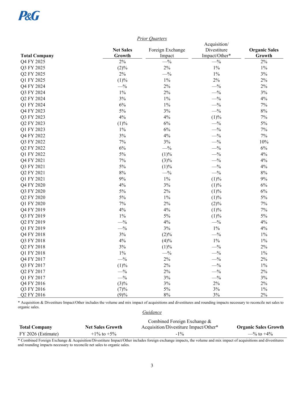 3 Prior Quarters Total Company Net Sales Growth Foreign Exchange Impact Acquisition/ Divestiture Impact/Other* Organic Sales Growth Q4 FY 2025 2% —% —% 2% Q3 FY 2025 (2)% 2% 1% 1% Q2 FY 2025 2% —% 1% 3% Q1 FY 2025 (1)% 1% 2% 2% Q4 FY 2024 —% 2% —% 2% Q3 FY 2024 1% 2% —% 3% Q2 FY 2024 3% 1% —% 4% Q1 FY 2024 6% 1% —% 7% Q4 FY 2023 5% 3% —% 8% Q3 FY 2023 4% 4% (1)% 7% Q2 FY 2023 (1)% 6% —% 5% Q1 FY 2023 1% 6% —% 7% Q4 FY 2022 3% 4% —% 7% Q3 FY 2022 7% 3% —% 10% Q2 FY 2022 6% —% —% 6% Q1 FY 2022 5% (1)% —% 4% Q4 FY 2021 7% (3)% —% 4% Q3 FY 2021 5% (1)% —% 4% Q2 FY 2021 8% —% —% 8% Q1 FY 2021 9% 1% (1)% 9% Q4 FY 2020 4% 3% (1)% 6% Q3 FY 2020 5% 2% (1)% 6% Q2 FY 2020 5% 1% (1)% 5% Q1 FY 2020 7% 2% (2)% 7% Q4 FY 2019 4% 4% (1)% 7% Q3 FY 2019 1% 5% (1)% 5% Q2 FY 2019 —% 4% —% 4% Q1 FY 2019 —% 3% 1% 4% Q4 FY 2018 3% (2)% —% 1% Q3 FY 2018 4% (4)% 1% 1% Q2 FY 2018 3% (1)% —% 2% Q1 FY 2018 1% —% —% 1% Q4 FY 2017 —% 2% —% 2% Q3 FY 2017 (1)% 2% —% 1% Q2 FY 2017 —% 2% —% 2% Q1 FY 2017 —% 3% —% 3% Q4 FY 2016 (3)% 3% 2% 2% Q3 FY 2016 (7)% 5% 3% 1% Q2 FY 2016 (9)% 8% 3% 2% * Acquisition & Divestiture Impact/Other includes the volume and mix impact of acquisitions and divestitures and rounding impacts necessary to reconcile net sales to organic sales. Guidance Total Company Net Sales Growth Combined Foreign Exchange & Acquisition/Divestiture Impact/Other* Organic Sales Growth FY 2026 (Estimate) +1% to +5% -1% —% to +4% * Combined Foreign Exchange & Acquisition/Divestiture Impact/Other includes foreign exchange impacts, the volume and mix impact of acquisitions and divestitures and rounding impacts necessary to reconcile net sales to organic sales.