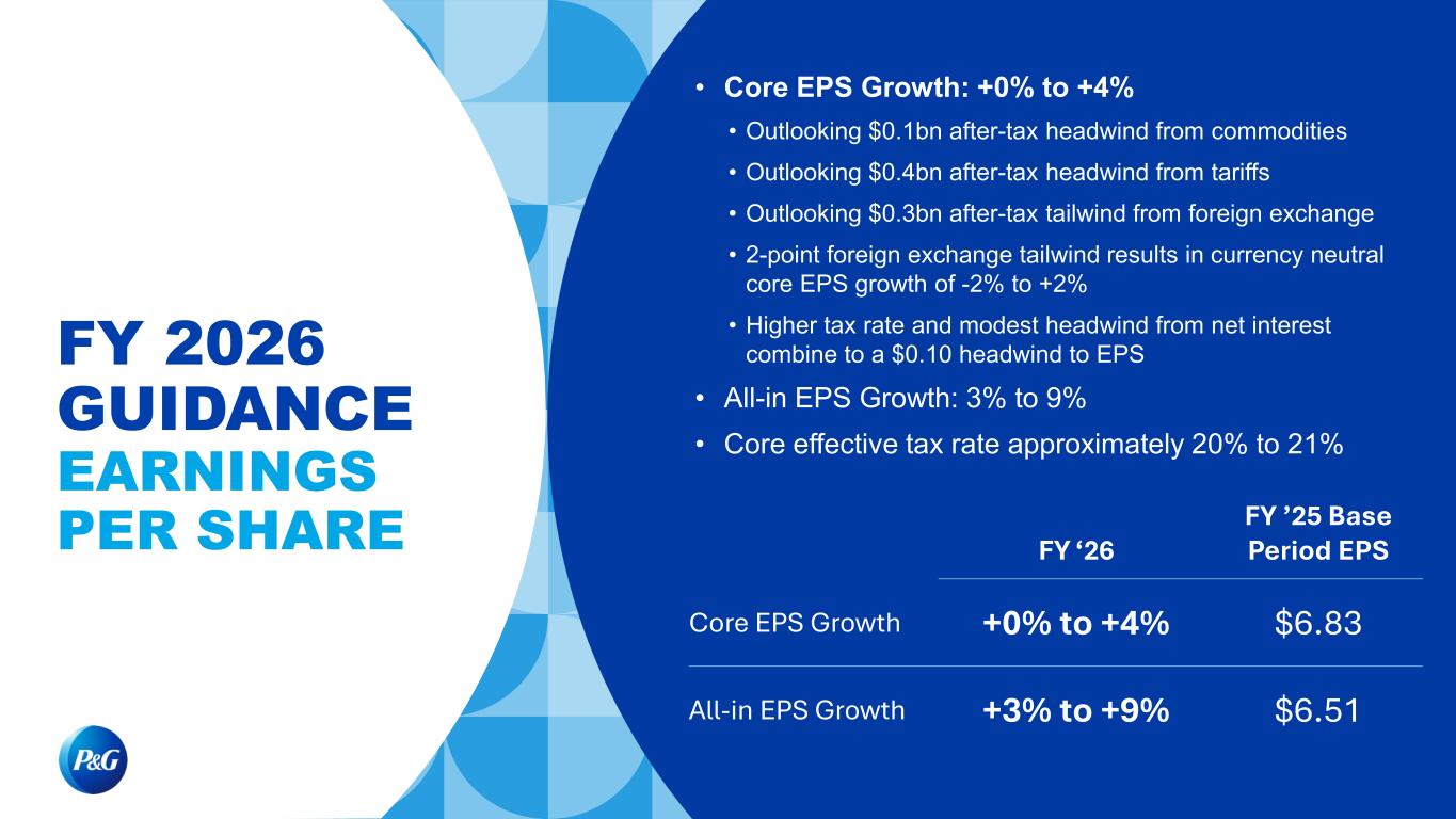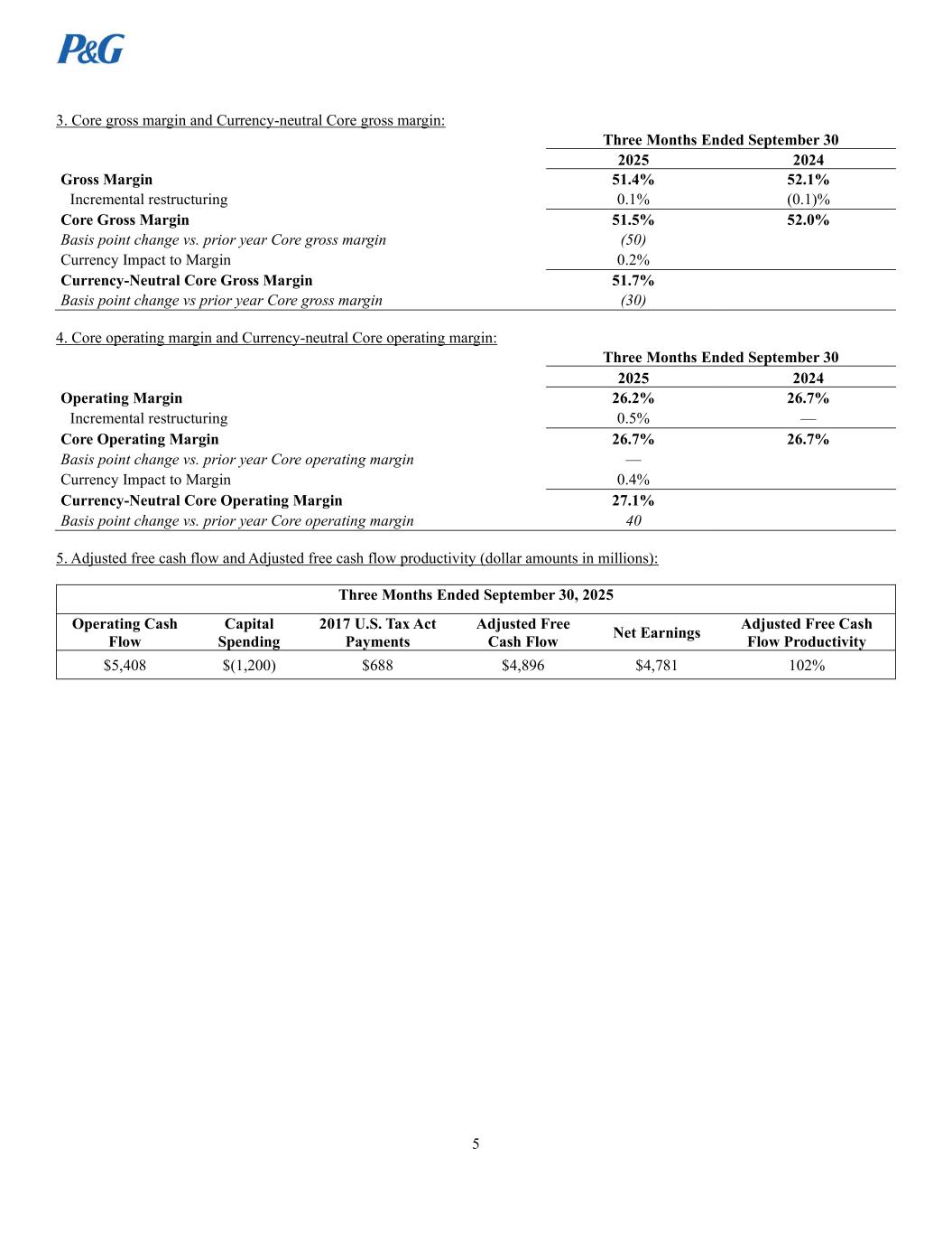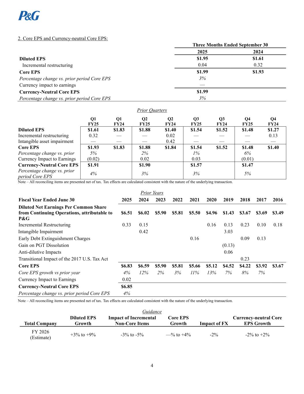 4 2. Core EPS and Currency-neutral Core EPS: Three Months Ended September 30 2025 2024 Diluted EPS $1.95 $1.61 Incremental restructuring 0.04 0.32 Core EPS $1.99 $1.93 Percentage change vs. prior period Core EPS 3% Currency impact to earnings — Currency-Neutral Core EPS $1.99 Percentage change vs. prior period Core EPS 3% Prior Quarters Note – All reconciling items are presented net of tax. Tax effects are calculated consistent with the nature of the underlying transaction. Prior Years Fiscal Year Ended June 30 2025 2024 2023 2022 2021 2020 2019 2018 2017 2016 Diluted Net Earnings Per Common Share from Continuing Operations, attributable to P&G $6.51 $6.02 $5.90 $5.81 $5.50 $4.96 $1.43 $3.67 $3.69 $3.49 Incremental Restructuring 0.33 0.15 0.16 0.13 0.23 0.10 0.18 Intangible Impairment 0.42 3.03 Early Debt Extinguishment Charges 0.16 0.09 0.13 Gain on PGT Dissolution (0.13) Anti-dilutive Impacts 0.06 Transitional Impact of the 2017 U.S. Tax Act 0.23 Core EPS $6.83 $6.59 $5.90 $5.81 $5.66 $5.12 $4.52 $4.22 $3.92 $3.67 Core EPS growth vs prior year 4% 12% 2% 3% 11% 13% 7% 8% 7% Currency Impact to Earnings 0.02 Currency-Neutral Core EPS $6.85 Percentage change vs. prior period Core EPS 4% Note – All reconciling items are presented net of tax. Tax effects are calculated consistent with the nature of the underlying transaction. Guidance Total Company Diluted EPS Growth Impact of Incremental Non-Core Items Core EPS Growth Impact of FX Currency-neutral Core EPS Growth FY 2026 (Estimate) +3% to +9% -3% to -5% —% to +4% -2% -2% to +2% Q1 FY25 Q1 FY24 Q2 FY25 Q2 FY24 Q3 FY25 Q3 FY24 Q4 FY25 Q4 FY24 Diluted EPS $1.61 $1.83 $1.88 $1.40 $1.54 $1.52 $1.48 $1.27 Incremental restructuring 0.32 — — 0.02 — — — 0.13 Intangible asset impairment — — — 0.42 — — — — Core EPS $1.93 $1.83 $1.88 $1.84 $1.54 $1.52 $1.48 $1.40 Percentage change vs. prior 5% 2% 1% 6% Currency Impact to Earnings (0.02) 0.02 0.03 (0.01) Currency-Neutral Core EPS $1.91 $1.90 $1.57 $1.47 Percentage change vs. prior period Core EPS 4% 3% 3% 5%