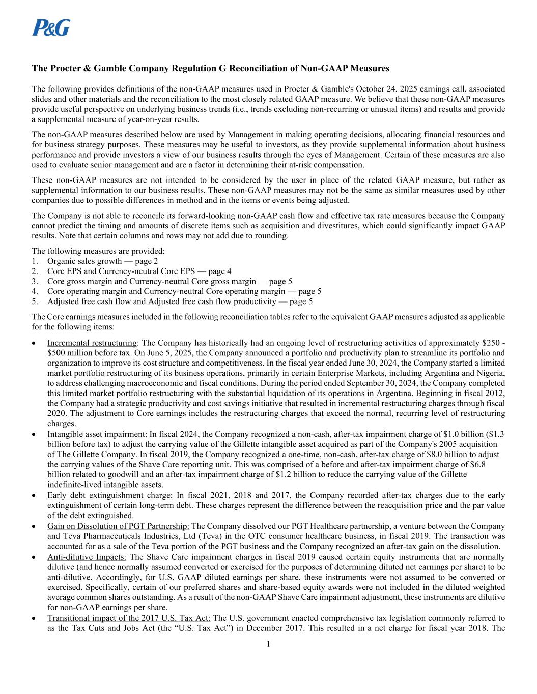 1 The Procter & Gamble Company Regulation G Reconciliation of Non-GAAP Measures The following provides definitions of the non-GAAP measures used in Procter & Gamble's October 24, 2025 earnings call, associated slides and other materials and the reconciliation to the most closely related GAAP measure. We believe that these non-GAAP measures provide useful perspective on underlying business trends (i.e., trends excluding non-recurring or unusual items) and results and provide a supplemental measure of year-on-year results. The non-GAAP measures described below are used by Management in making operating decisions, allocating financial resources and for business strategy purposes. These measures may be useful to investors, as they provide supplemental information about business performance and provide investors a view of our business results through the eyes of Management. Certain of these measures are also used to evaluate senior management and are a factor in determining their at-risk compensation. These non-GAAP measures are not intended to be considered by the user in place of the related GAAP measure, but rather as supplemental information to our business results. These non-GAAP measures may not be the same as similar measures used by other companies due to possible differences in method and in the items or events being adjusted. The Company is not able to reconcile its forward-looking non-GAAP cash flow and effective tax rate measures because the Company cannot predict the timing and amounts of discrete items such as acquisition and divestitures, which could significantly impact GAAP results. Note that certain columns and rows may not add due to rounding. The following measures are provided: 1. Organic sales growth — page 2 2. Core EPS and Currency-neutral Core EPS — page 4 3. Core gross margin and Currency-neutral Core gross margin — page 5 4. Core operating margin and Currency-neutral Core operating margin — page 5 5. Adjusted free cash flow and Adjusted free cash flow productivity — page 5 The Core earnings measures included in the following reconciliation tables refer to the equivalent GAAP measures adjusted as applicable for the following items:  Incremental restructuring: The Company has historically had an ongoing level of restructuring activities of approximately $250 - $500 million before tax. On June 5, 2025, the Company announced a portfolio and productivity plan to streamline its portfolio and organization to improve its cost structure and competitiveness. In the fiscal year ended June 30, 2024, the Company started a limited market portfolio restructuring of its business operations, primarily in certain Enterprise Markets, including Argentina and Nigeria, to address challenging macroeconomic and fiscal conditions. During the period ended September 30, 2024, the Company completed this limited market portfolio restructuring with the substantial liquidation of its operations in Argentina. Beginning in fiscal 2012, the Company had a strategic productivity and cost savings initiative that resulted in incremental restructuring charges through fiscal 2020. The adjustment to Core earnings includes the restructuring charges that exceed the normal, recurring level of restructuring charges.  Intangible asset impairment: In fiscal 2024, the Company recognized a non-cash, after-tax impairment charge of $1.0 billion ($1.3 billion before tax) to adjust the carrying value of the Gillette intangible asset acquired as part of the Company's 2005 acquisition of The Gillette Company. In fiscal 2019, the Company recognized a one-time, non-cash, after-tax charge of $8.0 billion to adjust the carrying values of the Shave Care reporting unit. This was comprised of a before and after-tax impairment charge of $6.8 billion related to goodwill and an after-tax impairment charge of $1.2 billion to reduce the carrying value of the Gillette indefinite-lived intangible assets.  Early debt extinguishment charge: In fiscal 2021, 2018 and 2017, the Company recorded after-tax charges due to the early extinguishment of certain long-term debt. These charges represent the difference between the reacquisition price and the par value of the debt extinguished.  Gain on Dissolution of PGT Partnership: The Company dissolved our PGT Healthcare partnership, a venture between the Company and Teva Pharmaceuticals Industries, Ltd (Teva) in the OTC consumer healthcare business, in fiscal 2019. The transaction was accounted for as a sale of the Teva portion of the PGT business and the Company recognized an after-tax gain on the dissolution.  Anti-dilutive Impacts: The Shave Care impairment charges in fiscal 2019 caused certain equity instruments that are normally dilutive (and hence normally assumed converted or exercised for the purposes of determining diluted net earnings per share) to be anti-dilutive. Accordingly, for U.S. GAAP diluted earnings per share, these instruments were not assumed to be converted or exercised. Specifically, certain of our preferred shares and share-based equity awards were not included in the diluted weighted average common shares outstanding. As a result of the non-GAAP Shave Care impairment adjustment, these instruments are dilutive for non-GAAP earnings per share.  Transitional impact of the 2017 U.S. Tax Act: The U.S. government enacted comprehensive tax legislation commonly referred to as the Tax Cuts and Jobs Act (the “U.S. Tax Act”) in December 2017. This resulted in a net charge for fiscal year 2018. The