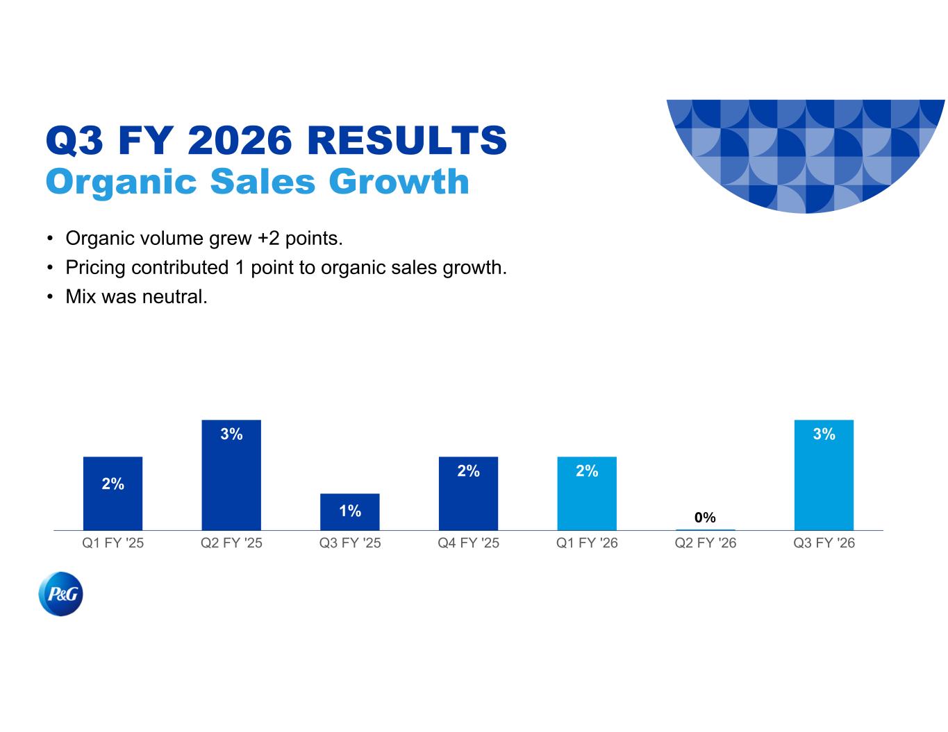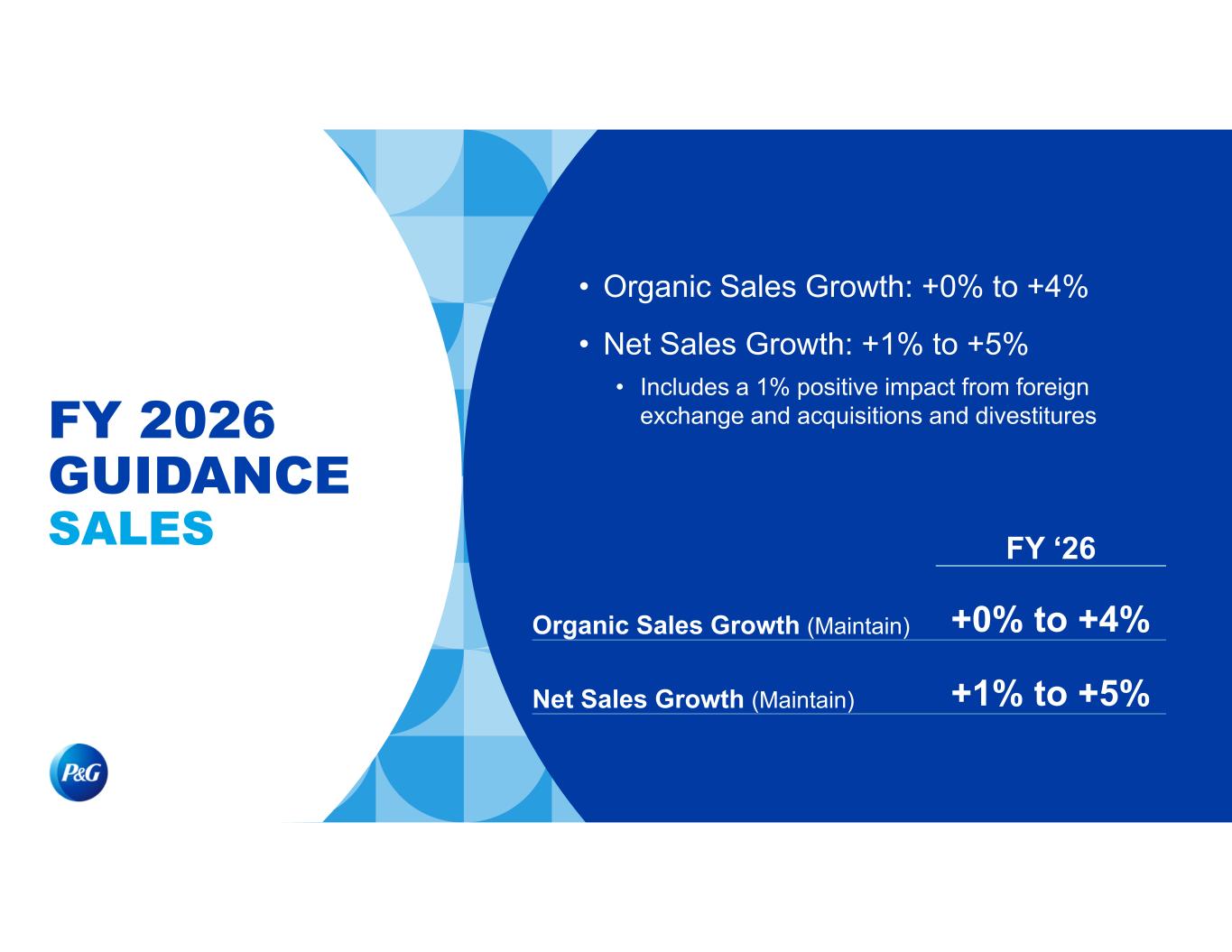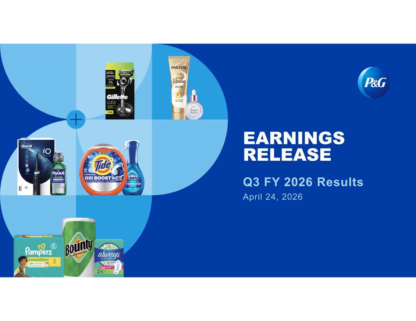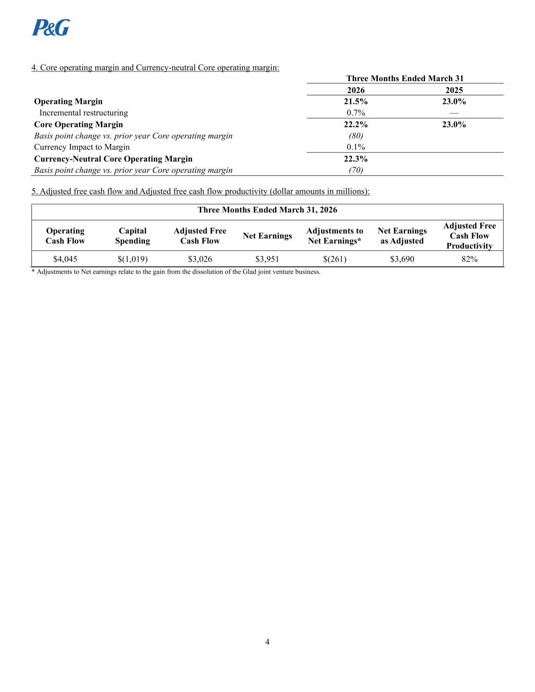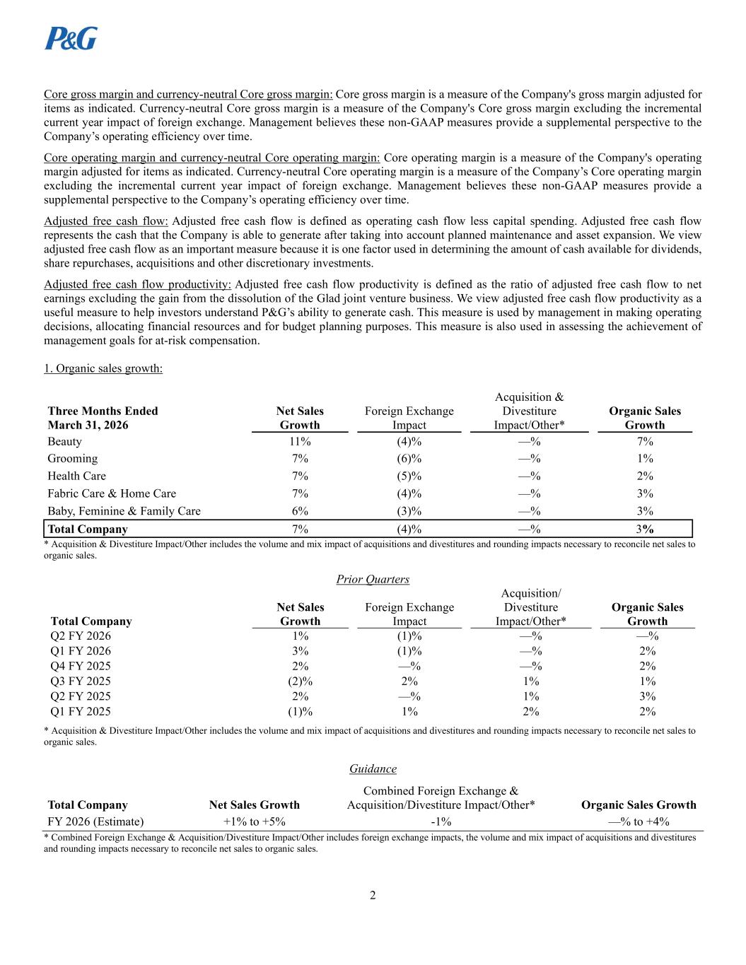 2 Core gross margin and currency-neutral Core gross margin: Core gross margin is a measure of the Company's gross margin adjusted for items as indicated. Currency-neutral Core gross margin is a measure of the Company's Core gross margin excluding the incremental current year impact of foreign exchange. Management believes these non-GAAP measures provide a supplemental perspective to the Company’s operating efficiency over time. Core operating margin and currency-neutral Core operating margin: Core operating margin is a measure of the Company's operating margin adjusted for items as indicated. Currency-neutral Core operating margin is a measure of the Company’s Core operating margin excluding the incremental current year impact of foreign exchange. Management believes these non-GAAP measures provide a supplemental perspective to the Company’s operating efficiency over time. Adjusted free cash flow: Adjusted free cash flow is defined as operating cash flow less capital spending. Adjusted free cash flow represents the cash that the Company is able to generate after taking into account planned maintenance and asset expansion. We view adjusted free cash flow as an important measure because it is one factor used in determining the amount of cash available for dividends, share repurchases, acquisitions and other discretionary investments. Adjusted free cash flow productivity: Adjusted free cash flow productivity is defined as the ratio of adjusted free cash flow to net earnings excluding the gain from the dissolution of the Glad joint venture business. We view adjusted free cash flow productivity as a useful measure to help investors understand P&G’s ability to generate cash. This measure is used by management in making operating decisions, allocating financial resources and for budget planning purposes. This measure is also used in assessing the achievement of management goals for at-risk compensation. 1. Organic sales growth: Three Months Ended March 31, 2026 Net Sales Growth Foreign Exchange Impact Acquisition & Divestiture Impact/Other* Organic Sales Growth Beauty 11% (4)% —% 7% Grooming 7% (6)% —% 1% Health Care 7% (5)% —% 2% Fabric Care & Home Care 7% (4)% —% 3% Baby, Feminine & Family Care 6% (3)% —% 3% Total Company 7% (4)% —% 3% * Acquisition & Divestiture Impact/Other includes the volume and mix impact of acquisitions and divestitures and rounding impacts necessary to reconcile net sales to organic sales. Prior Quarters Total Company Net Sales Growth Foreign Exchange Impact Acquisition/ Divestiture Impact/Other* Organic Sales Growth Q2 FY 2026 1% (1)% —% —% Q1 FY 2026 3% (1)% —% 2% Q4 FY 2025 2% —% —% 2% Q3 FY 2025 (2)% 2% 1% 1% Q2 FY 2025 2% —% 1% 3% Q1 FY 2025 (1)% 1% 2% 2% * Acquisition & Divestiture Impact/Other includes the volume and mix impact of acquisitions and divestitures and rounding impacts necessary to reconcile net sales to organic sales. Guidance Total Company Net Sales Growth Combined Foreign Exchange & Acquisition/Divestiture Impact/Other* Organic Sales Growth FY 2026 (Estimate) +1% to +5% -1% —% to +4% * Combined Foreign Exchange & Acquisition/Divestiture Impact/Other includes foreign exchange impacts, the volume and mix impact of acquisitions and divestitures and rounding impacts necessary to reconcile net sales to organic sales.