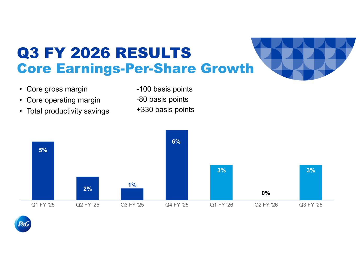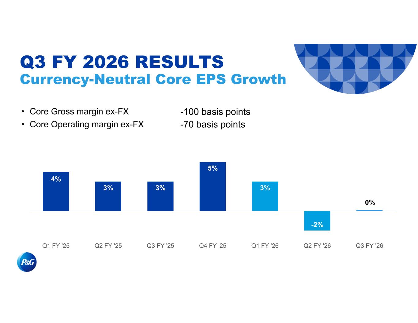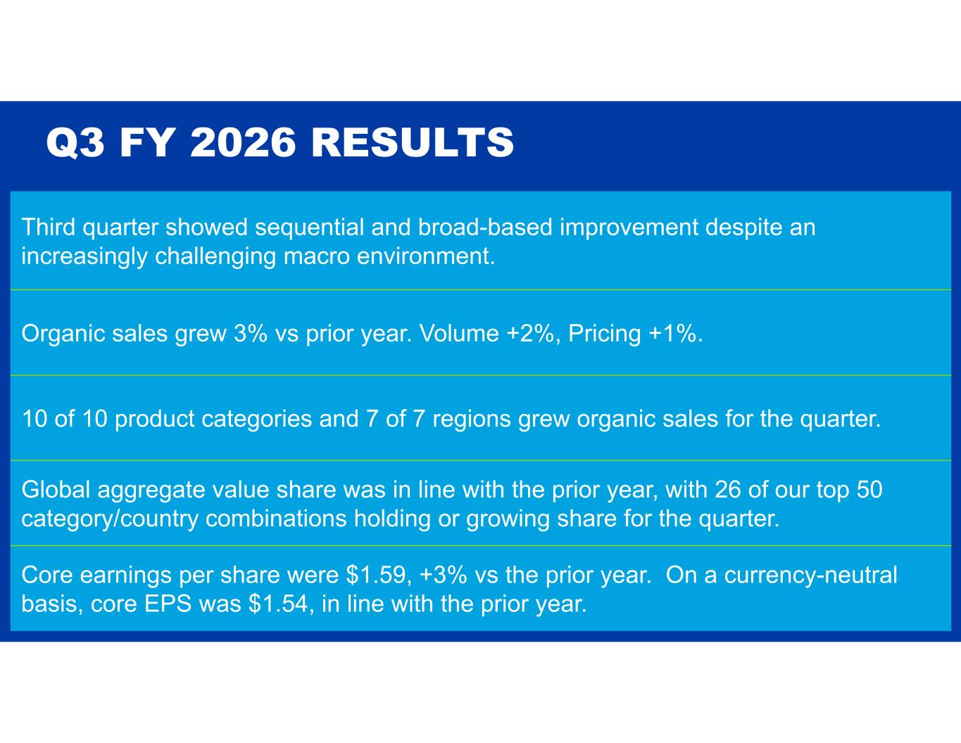 Third quarter showed sequential and broad-based improvement despite an increasingly challenging macro environment. Organic sales grew 3% vs prior year. Volume +2%, Pricing +1%. 10 of 10 product categories and 7 of 7 regions grew organic sales for the quarter. Global aggregate value share was in line with the prior year, with 26 of our top 50 category/country combinations holding or growing share for the quarter. Core earnings per share were $1.59, +3% vs the prior year. On a currency-neutral basis, core EPS was $1.54, in line with the prior year. Q3 FY 2026 RESULTS