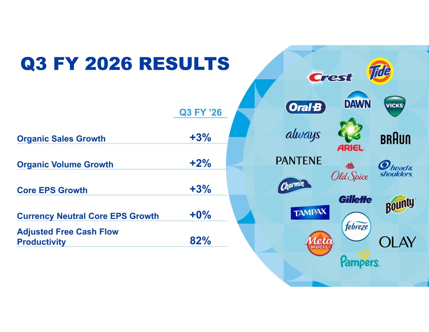 Q3 FY ’26 +3%Organic Sales Growth +2%Organic Volume Growth +3%Core EPS Growth +0%Currency Neutral Core EPS Growth 82% Adjusted Free Cash Flow Productivity Q3 FY 2026 RESULTS
