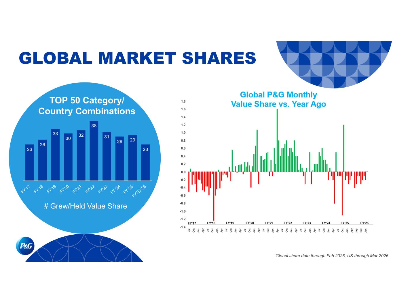 TOP 50 Category/ Country Combinations # Grew/Held Value Share 23 26 33 30 32 38 31 28 29 23 Global share data through Feb 2026, US through Mar 2026 GLOBAL MARKET SHARES