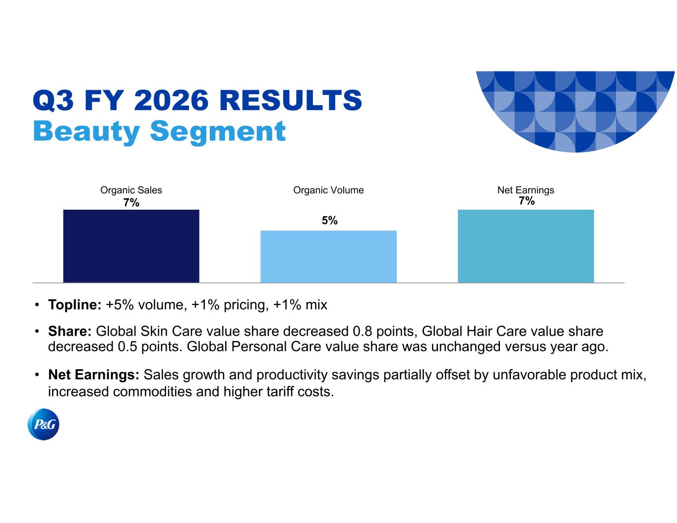 7% 5% 7% Organic Sales Organic Volume Net Earnings • Topline: +5% volume, +1% pricing, +1% mix • Share: Global Skin Care value share decreased 0.8 points, Global Hair Care value share decreased 0.5 points. Global Personal Care value share was unchanged versus year ago. • Net Earnings: Sales growth and productivity savings partially offset by unfavorable product mix, increased commodities and higher tariff costs. Q3 FY 2026 RESULTS Beauty Segment