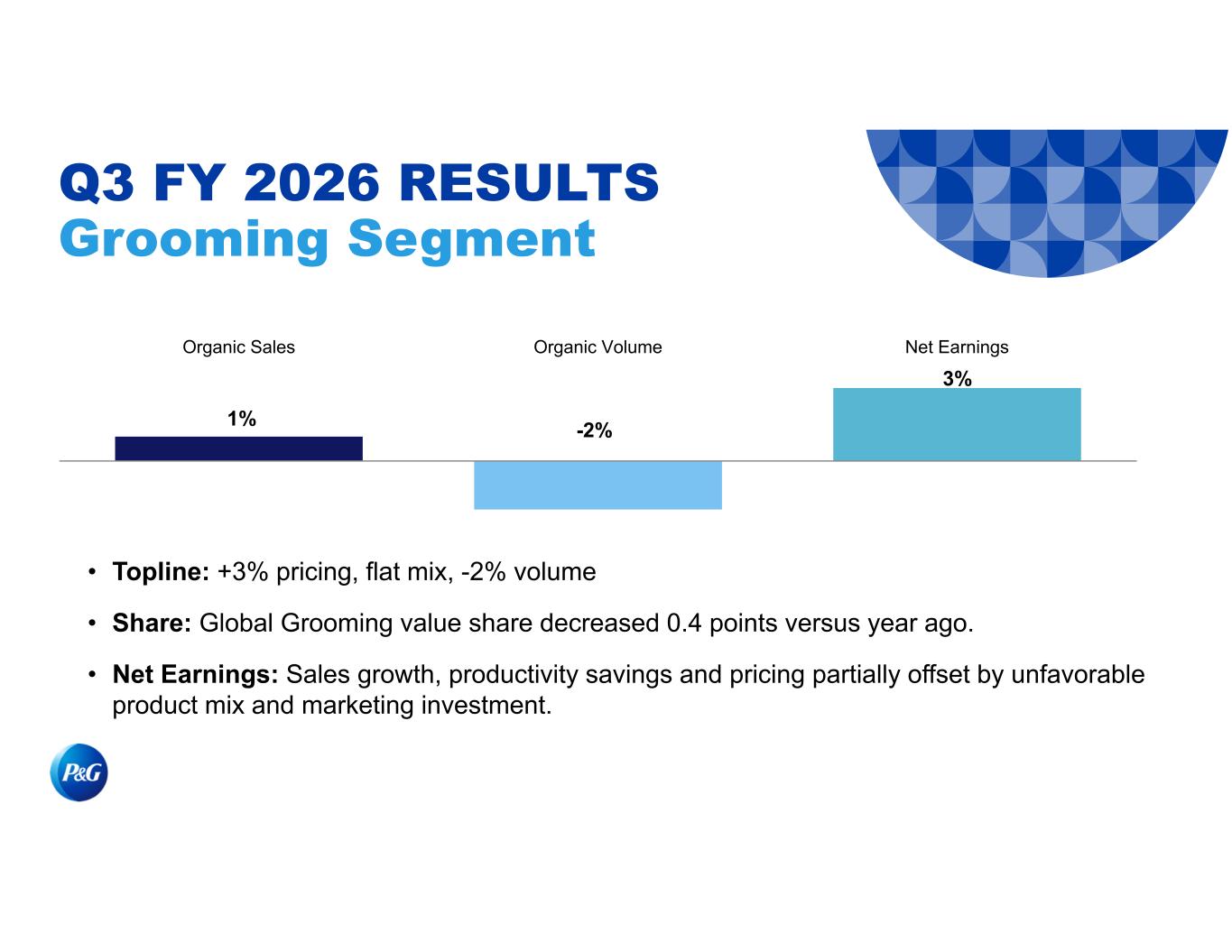 1% -2% 3% Organic Sales Organic Volume Net Earnings • Topline: +3% pricing, flat mix, -2% volume • Share: Global Grooming value share decreased 0.4 points versus year ago. • Net Earnings: Sales growth, productivity savings and pricing partially offset by unfavorable product mix and marketing investment. Q3 FY 2026 RESULTS Grooming Segment