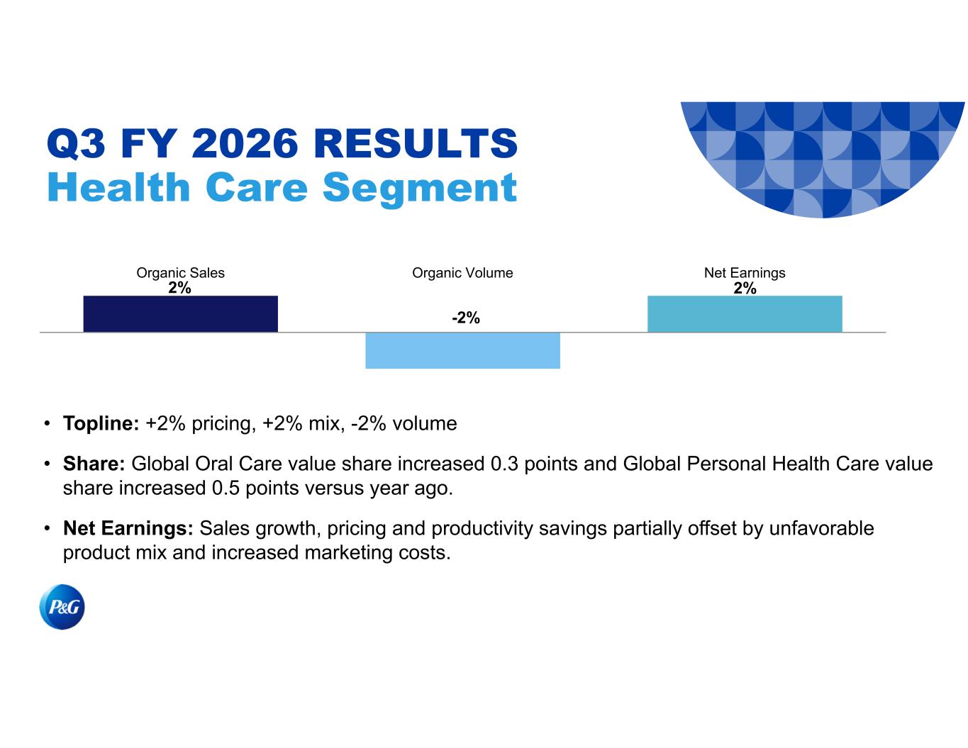 2% -2% 2% Organic Sales Organic Volume Net Earnings Q3 FY 2026 RESULTS Health Care Segment • Topline: +2% pricing, +2% mix, -2% volume • Share: Global Oral Care value share increased 0.3 points and Global Personal Health Care value share increased 0.5 points versus year ago. • Net Earnings: Sales growth, pricing and productivity savings partially offset by unfavorable product mix and increased marketing costs.
