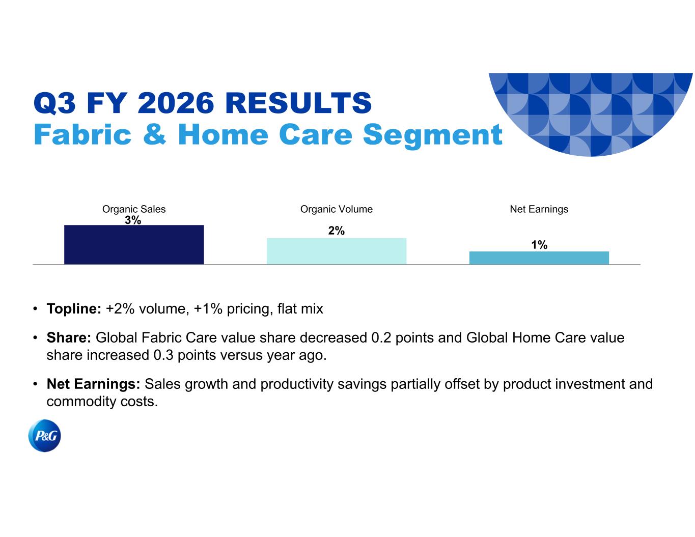 3% 2% 1% Organic Sales Organic Volume Net Earnings • Topline: +2% volume, +1% pricing, flat mix • Share: Global Fabric Care value share decreased 0.2 points and Global Home Care value share increased 0.3 points versus year ago. • Net Earnings: Sales growth and productivity savings partially offset by product investment and commodity costs. Q3 FY 2026 RESULTS Fabric & Home Care Segment