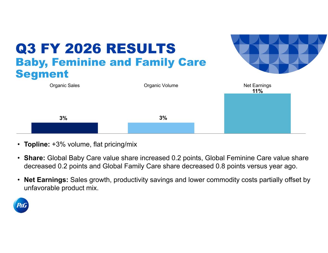 3% 3% 11% Organic Sales Organic Volume Net Earnings • Topline: +3% volume, flat pricing/mix • Share: Global Baby Care value share increased 0.2 points, Global Feminine Care value share decreased 0.2 points and Global Family Care share decreased 0.8 points versus year ago. • Net Earnings: Sales growth, productivity savings and lower commodity costs partially offset by unfavorable product mix. Q3 FY 2026 RESULTS Baby, Feminine and Family Care Segment