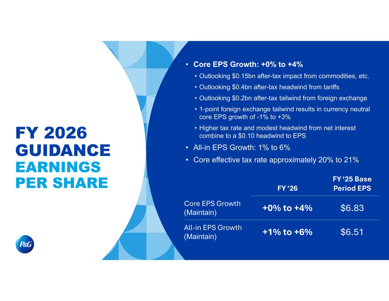 FY 2026 GUIDANCE EARNINGS PER SHARE • Core EPS Growth: +0% to +4% • Outlooking $0.15bn after-tax impact from commodities, etc. • Outlooking $0.4bn after-tax headwind from tariffs • Outlooking $0.2bn after-tax tailwind from foreign exchange • 1-point foreign exchange tailwind results in currency neutral core EPS growth of -1% to +3% • Higher tax rate and modest headwind from net interest combine to a $0.10 headwind to EPS • All-in EPS Growth: 1% to 6% • Core effective tax rate approximately 20% to 21% FY ‘25 Base Period EPSFY ‘26 $6.83+0% to +4%Core EPS Growth (Maintain) $6.51+1% to +6%All-in EPS Growth (Maintain)