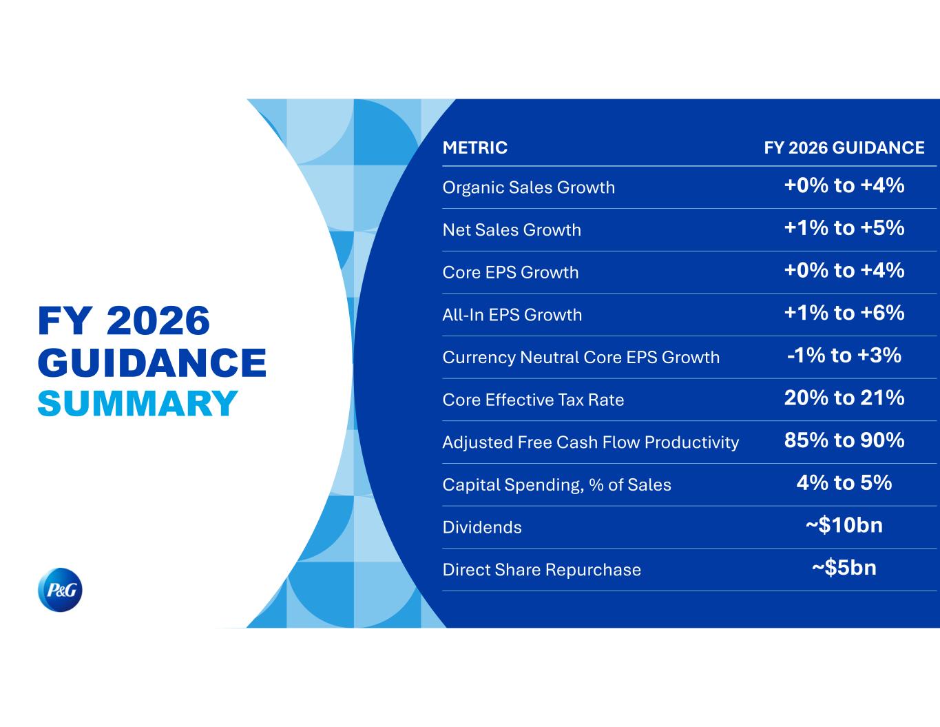 FY 2026 GUIDANCE SUMMARY FY 2026 GUIDANCEMETRIC +0% to +4%Organic Sales Growth +1% to +5%Net Sales Growth +0% to +4%Core EPS Growth +1% to +6%All-In EPS Growth -1% to +3%Currency Neutral Core EPS Growth 20% to 21%Core Effective Tax Rate 85% to 90%Adjusted Free Cash Flow Productivity 4% to 5%Capital Spending, % of Sales ~$10bnDividends ~$5bnDirect Share Repurchase