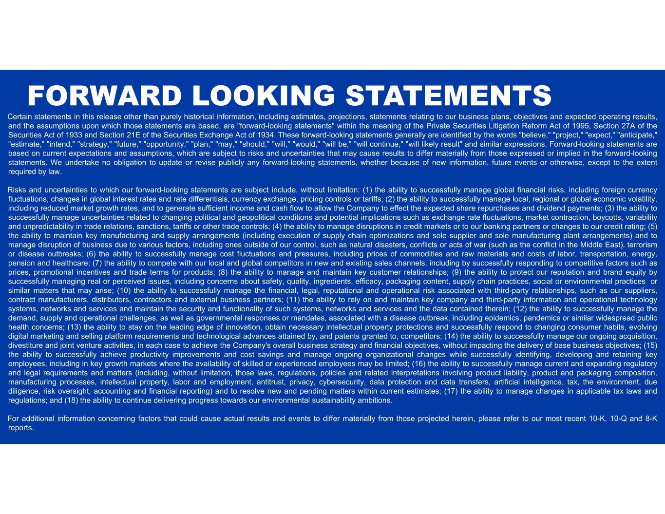 Certain statements in this release other than purely historical information, including estimates, projections, statements relating to our business plans, objectives and expected operating results, and the assumptions upon which those statements are based, are "forward-looking statements" within the meaning of the Private Securities Litigation Reform Act of 1995, Section 27A of the Securities Act of 1933 and Section 21E of the Securities Exchange Act of 1934. These forward-looking statements generally are identified by the words "believe," "project," "expect," "anticipate," "estimate," "intend," "strategy," "future," "opportunity," "plan," "may," "should," "will," "would," "will be," "will continue," "will likely result" and similar expressions. Forward-looking statements are based on current expectations and assumptions, which are subject to risks and uncertainties that may cause results to differ materially from those expressed or implied in the forward-looking statements. We undertake no obligation to update or revise publicly any forward-looking statements, whether because of new information, future events or otherwise, except to the extent required by law. Risks and uncertainties to which our forward-looking statements are subject include, without limitation: (1) the ability to successfully manage global financial risks, including foreign currency fluctuations, changes in global interest rates and rate differentials, currency exchange, pricing controls or tariffs; (2) the ability to successfully manage local, regional or global economic volatility, including reduced market growth rates, and to generate sufficient income and cash flow to allow the Company to effect the expected share repurchases and dividend payments; (3) the ability to successfully manage uncertainties related to changing political and geopolitical conditions and potential implications such as exchange rate fluctuations, market contraction, boycotts, variability and unpredictability in trade relations, sanctions, tariffs or other trade controls; (4) the ability to manage disruptions in credit markets or to our banking partners or changes to our credit rating; (5) the ability to maintain key manufacturing and supply arrangements (including execution of supply chain optimizations and sole supplier and sole manufacturing plant arrangements) and to manage disruption of business due to various factors, including ones outside of our control, such as natural disasters, conflicts or acts of war (such as the conflict in the Middle East), terrorism or disease outbreaks; (6) the ability to successfully manage cost fluctuations and pressures, including prices of commodities and raw materials and costs of labor, transportation, energy, pension and healthcare; (7) the ability to compete with our local and global competitors in new and existing sales channels, including by successfully responding to competitive factors such as prices, promotional incentives and trade terms for products; (8) the ability to manage and maintain key customer relationships; (9) the ability to protect our reputation and brand equity by successfully managing real or perceived issues, including concerns about safety, quality, ingredients, efficacy, packaging content, supply chain practices, social or environmental practices or similar matters that may arise; (10) the ability to successfully manage the financial, legal, reputational and operational risk associated with third-party relationships, such as our suppliers, contract manufacturers, distributors, contractors and external business partners; (11) the ability to rely on and maintain key company and third-party information and operational technology systems, networks and services and maintain the security and functionality of such systems, networks and services and the data contained therein; (12) the ability to successfully manage the demand, supply and operational challenges, as well as governmental responses or mandates, associated with a disease outbreak, including epidemics, pandemics or similar widespread public health concerns; (13) the ability to stay on the leading edge of innovation, obtain necessary intellectual property protections and successfully respond to changing consumer habits, evolving digital marketing and selling platform requirements and technological advances attained by, and patents granted to, competitors; (14) the ability to successfully manage our ongoing acquisition, divestiture and joint venture activities, in each case to achieve the Company's overall business strategy and financial objectives, without impacting the delivery of base business objectives; (15) the ability to successfully achieve productivity improvements and cost savings and manage ongoing organizational changes while successfully identifying, developing and retaining key employees, including in key growth markets where the availability of skilled or experienced employees may be limited; (16) the ability to successfully manage current and expanding regulatory and legal requirements and matters (including, without limitation, those laws, regulations, policies and related interpretations involving product liability, product and packaging composition, manufacturing processes, intellectual property, labor and employment, antitrust, privacy, cybersecurity, data protection and data transfers, artificial intelligence, tax, the environment, due diligence, risk oversight, accounting and financial reporting) and to resolve new and pending matters within current estimates; (17) the ability to manage changes in applicable tax laws and regulations; and (18) the ability to continue delivering progress towards our environmental sustainability ambitions. For additional information concerning factors that could cause actual results and events to differ materially from those projected herein, please refer to our most recent 10-K, 10-Q and 8-K reports. FORWARD LOOKING STATEMENTS
