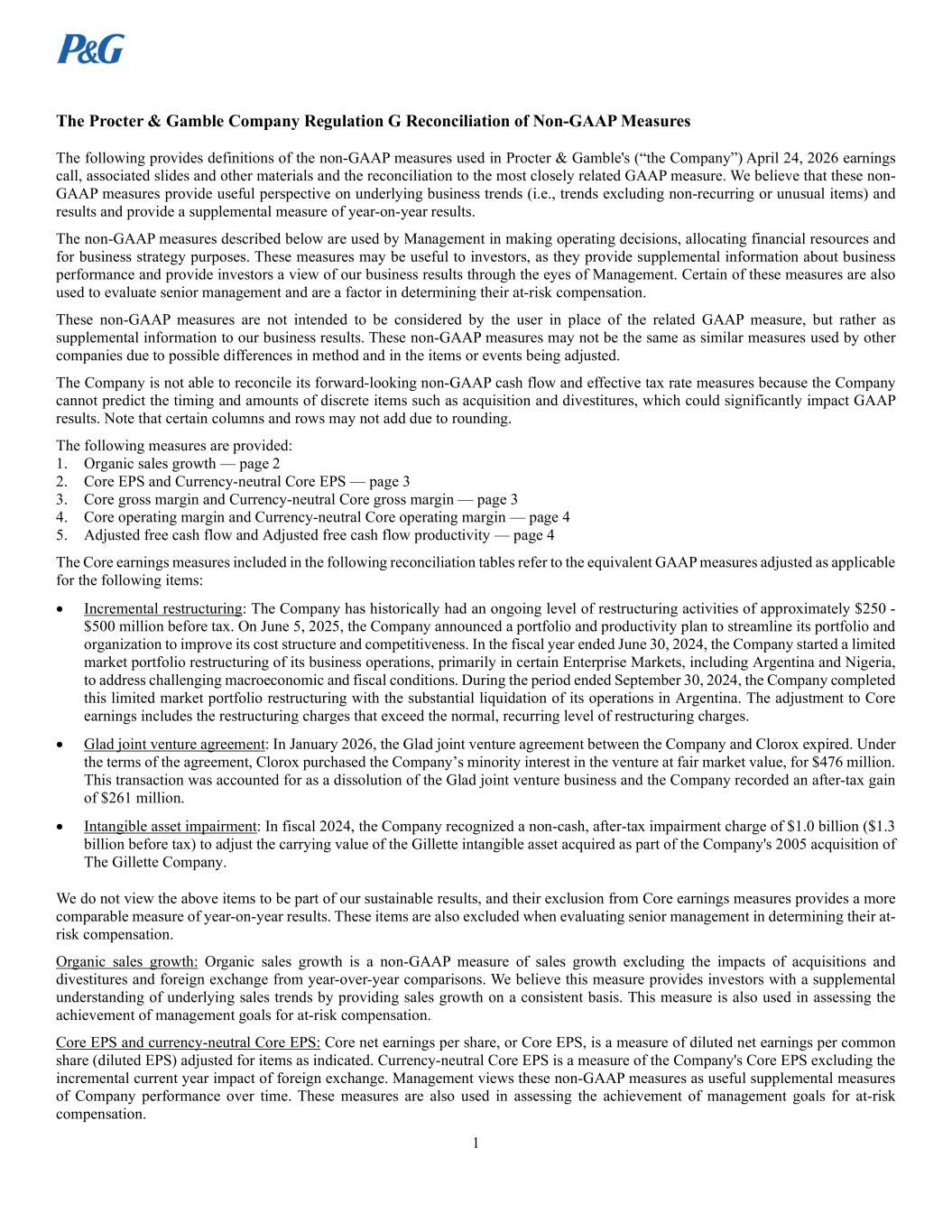 1 The Procter & Gamble Company Regulation G Reconciliation of Non-GAAP Measures The following provides definitions of the non-GAAP measures used in Procter & Gamble's (“the Company”) April 24, 2026 earnings call, associated slides and other materials and the reconciliation to the most closely related GAAP measure. We believe that these non- GAAP measures provide useful perspective on underlying business trends (i.e., trends excluding non-recurring or unusual items) and results and provide a supplemental measure of year-on-year results. The non-GAAP measures described below are used by Management in making operating decisions, allocating financial resources and for business strategy purposes. These measures may be useful to investors, as they provide supplemental information about business performance and provide investors a view of our business results through the eyes of Management. Certain of these measures are also used to evaluate senior management and are a factor in determining their at-risk compensation. These non-GAAP measures are not intended to be considered by the user in place of the related GAAP measure, but rather as supplemental information to our business results. These non-GAAP measures may not be the same as similar measures used by other companies due to possible differences in method and in the items or events being adjusted. The Company is not able to reconcile its forward-looking non-GAAP cash flow and effective tax rate measures because the Company cannot predict the timing and amounts of discrete items such as acquisition and divestitures, which could significantly impact GAAP results. Note that certain columns and rows may not add due to rounding. The following measures are provided: 1. Organic sales growth — page 2 2. Core EPS and Currency-neutral Core EPS — page 3 3. Core gross margin and Currency-neutral Core gross margin — page 3 4. Core operating margin and Currency-neutral Core operating margin — page 4 5. Adjusted free cash flow and Adjusted free cash flow productivity — page 4 The Core earnings measures included in the following reconciliation tables refer to the equivalent GAAP measures adjusted as applicable for the following items:  Incremental restructuring: The Company has historically had an ongoing level of restructuring activities of approximately $250 - $500 million before tax. On June 5, 2025, the Company announced a portfolio and productivity plan to streamline its portfolio and organization to improve its cost structure and competitiveness. In the fiscal year ended June 30, 2024, the Company started a limited market portfolio restructuring of its business operations, primarily in certain Enterprise Markets, including Argentina and Nigeria, to address challenging macroeconomic and fiscal conditions. During the period ended September 30, 2024, the Company completed this limited market portfolio restructuring with the substantial liquidation of its operations in Argentina. The adjustment to Core earnings includes the restructuring charges that exceed the normal, recurring level of restructuring charges.  Glad joint venture agreement: In January 2026, the Glad joint venture agreement between the Company and Clorox expired. Under the terms of the agreement, Clorox purchased the Company’s minority interest in the venture at fair market value, for $476 million. This transaction was accounted for as a dissolution of the Glad joint venture business and the Company recorded an after-tax gain of $261 million.  Intangible asset impairment: In fiscal 2024, the Company recognized a non-cash, after-tax impairment charge of $1.0 billion ($1.3 billion before tax) to adjust the carrying value of the Gillette intangible asset acquired as part of the Company's 2005 acquisition of The Gillette Company. We do not view the above items to be part of our sustainable results, and their exclusion from Core earnings measures provides a more comparable measure of year-on-year results. These items are also excluded when evaluating senior management in determining their at- risk compensation. Organic sales growth: Organic sales growth is a non-GAAP measure of sales growth excluding the impacts of acquisitions and divestitures and foreign exchange from year-over-year comparisons. We believe this measure provides investors with a supplemental understanding of underlying sales trends by providing sales growth on a consistent basis. This measure is also used in assessing the achievement of management goals for at-risk compensation. Core EPS and currency-neutral Core EPS: Core net earnings per share, or Core EPS, is a measure of diluted net earnings per common share (diluted EPS) adjusted for items as indicated. Currency-neutral Core EPS is a measure of the Company's Core EPS excluding the incremental current year impact of foreign exchange. Management views these non-GAAP measures as useful supplemental measures of Company performance over time. These measures are also used in assessing the achievement of management goals for at-risk compensation.