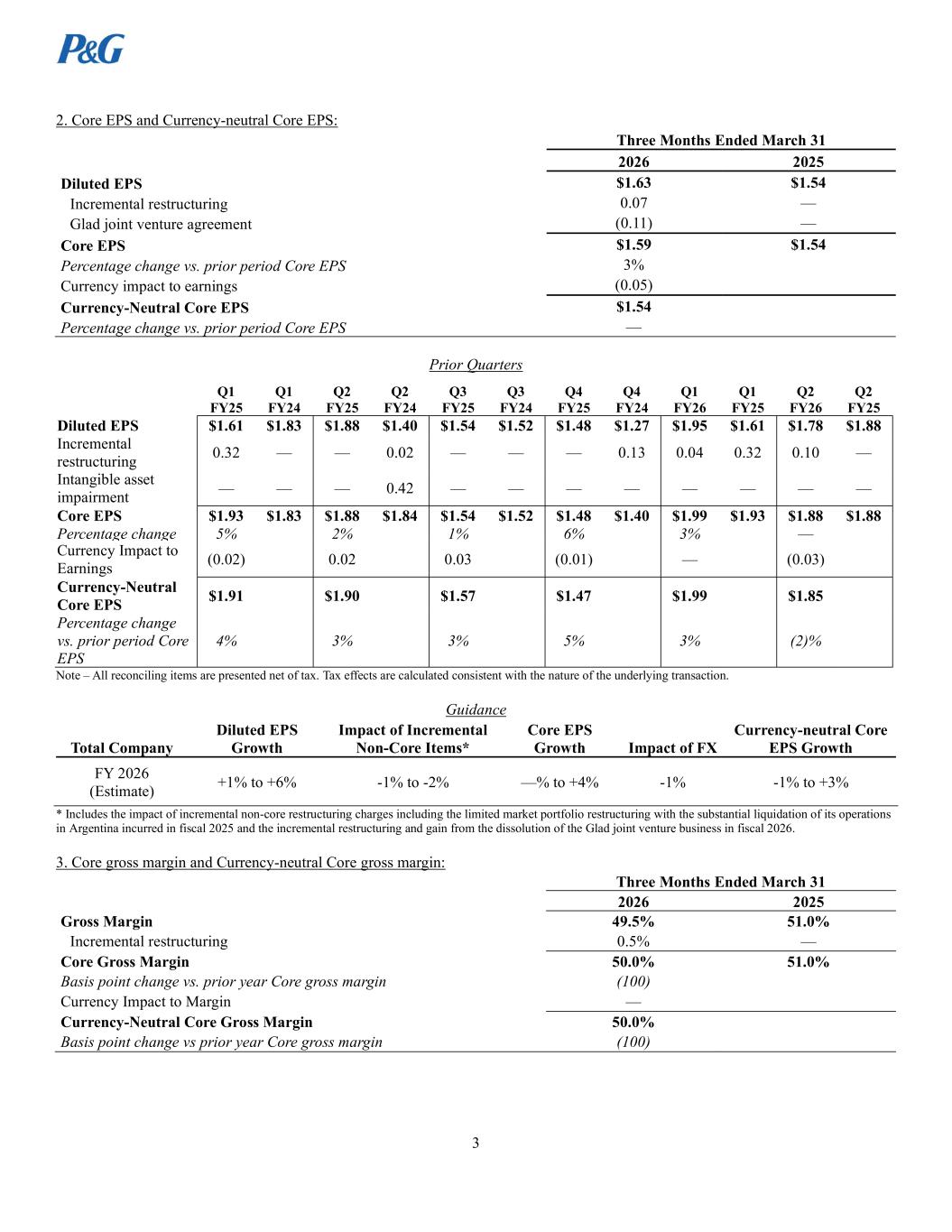 3 2. Core EPS and Currency-neutral Core EPS: Three Months Ended March 31 2026 2025 Diluted EPS $1.63 $1.54 Incremental restructuring 0.07 — Glad joint venture agreement (0.11) — Core EPS $1.59 $1.54 Percentage change vs. prior period Core EPS 3% Currency impact to earnings (0.05) Currency-Neutral Core EPS $1.54 Percentage change vs. prior period Core EPS — Prior Quarters Note – All reconciling items are presented net of tax. Tax effects are calculated consistent with the nature of the underlying transaction. Guidance Total Company Diluted EPS Growth Impact of Incremental Non-Core Items* Core EPS Growth Impact of FX Currency-neutral Core EPS Growth FY 2026 (Estimate) +1% to +6% -1% to -2% —% to +4% -1% -1% to +3% * Includes the impact of incremental non-core restructuring charges including the limited market portfolio restructuring with the substantial liquidation of its operations in Argentina incurred in fiscal 2025 and the incremental restructuring and gain from the dissolution of the Glad joint venture business in fiscal 2026. 3. Core gross margin and Currency-neutral Core gross margin: Three Months Ended March 31 2026 2025 Gross Margin 49.5% 51.0% Incremental restructuring 0.5% — Core Gross Margin 50.0% 51.0% Basis point change vs. prior year Core gross margin (100) Currency Impact to Margin — Currency-Neutral Core Gross Margin 50.0% Basis point change vs prior year Core gross margin (100) Q1 FY25 Q1 FY24 Q2 FY25 Q2 FY24 Q3 FY25 Q3 FY24 Q4 FY25 Q4 FY24 Q1 FY26 Q1 FY25 Q2 FY26 Q2 FY25 Diluted EPS $1.61 $1.83 $1.88 $1.40 $1.54 $1.52 $1.48 $1.27 $1.95 $1.61 $1.78 $1.88 Incremental restructuring 0.32 — — 0.02 — — — 0.13 0.04 0.32 0.10 — Intangible asset impairment — — — 0.42 — — — — — — — — Core EPS $1.93 $1.83 $1.88 $1.84 $1.54 $1.52 $1.48 $1.40 $1.99 $1.93 $1.88 $1.88 Percentage change 5% 2% 1% 6% 3% — Currency Impact to Earnings (0.02) 0.02 0.03 (0.01) — (0.03) Currency-Neutral Core EPS $1.91 $1.90 $1.57 $1.47 $1.99 $1.85 Percentage change vs. prior period Core EPS 4% 3% 3% 5% 3% (2)%