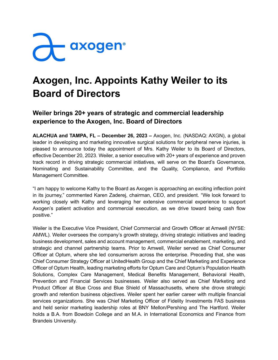 Axogen, Inc. Appoints Kathy Weiler to its Board of Directors Weiler brings 20+ years of strategic and commercial leadership experience to the Axogen, Inc. Board of Directors ALACHUA and TAMPA, FL – December 26, 2023 – Axogen, Inc. (NASDAQ: AXGN), a global leader in developing and marketing innovative surgical solutions for peripheral nerve injuries, is pleased to announce today the appointment of Mrs. Kathy Weiler to its Board of Directors, effective December 20, 2023. Weiler, a senior executive with 20+ years of experience and proven track record in driving strategic commercial initiatives, will serve on the Board’s Governance, Nominating and Sustainability Committee, and the Quality, Compliance, and Portfolio Management Committee. “I am happy to welcome Kathy to the Board as Axogen is approaching an exciting inflection point in its journey,” commented Karen Zaderej, chairman, CEO, and president. “We look forward to working closely with Kathy and leveraging her extensive commercial experience to support Axogen’s patient activation and commercial execution, as we drive toward being cash flow positive.” Weiler is the Executive Vice President, Chief Commercial and Growth Officer at Amwell (NYSE: AMWL). Weiler oversees the company’s growth strategy, driving strategic initiatives and leading business development, sales and account management, commercial enablement, marketing, and strategic and channel partnership teams. Prior to Amwell, Weiler served as Chief Consumer Officer at Optum, where she led consumerism across the enterprise. Preceding that, she was Chief Consumer Strategy Officer at UnitedHealth Group and the Chief Marketing and Experience Officer of Optum Health, leading marketing efforts for Optum Care and Optum’s Population Health Solutions, Complex Care Management, Medical Benefits Management, Behavioral Health, Prevention and Financial Services businesses. Weiler also served as Chief Marketing and Product Officer at Blue Cross and Blue Shield of Massachusetts, where she drove strategic growth and retention business objectives. Weiler spent her earlier career with multiple financial services organizations. She was Chief Marketing Officer of Fidelity Investments FAS business and held senior marketing leadership roles at BNY Mellon/Pershing and The Hartford. Weiler holds a B.A. from Bowdoin College and an M.A. in International Economics and Finance from Brandeis University.