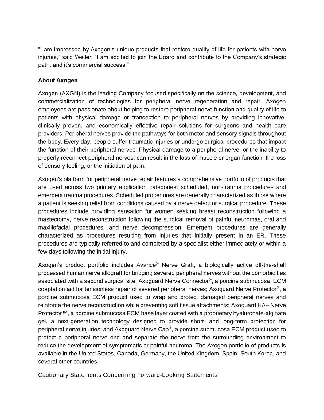 “I am impressed by Axogen’s unique products that restore quality of life for patients with nerve injuries,” said Weiler. “I am excited to join the Board and contribute to the Company’s strategic path, and it’s commercial success.” About Axogen Axogen (AXGN) is the leading Company focused specifically on the science, development, and commercialization of technologies for peripheral nerve regeneration and repair. Axogen employees are passionate about helping to restore peripheral nerve function and quality of life to patients with physical damage or transection to peripheral nerves by providing innovative, clinically proven, and economically effective repair solutions for surgeons and health care providers. Peripheral nerves provide the pathways for both motor and sensory signals throughout the body. Every day, people suffer traumatic injuries or undergo surgical procedures that impact the function of their peripheral nerves. Physical damage to a peripheral nerve, or the inability to properly reconnect peripheral nerves, can result in the loss of muscle or organ function, the loss of sensory feeling, or the initiation of pain. Axogen's platform for peripheral nerve repair features a comprehensive portfolio of products that are used across two primary application categories: scheduled, non-trauma procedures and emergent trauma procedures. Scheduled procedures are generally characterized as those where a patient is seeking relief from conditions caused by a nerve defect or surgical procedure. These procedures include providing sensation for women seeking breast reconstruction following a mastectomy, nerve reconstruction following the surgical removal of painful neuromas, oral and maxillofacial procedures, and nerve decompression. Emergent procedures are generally characterized as procedures resulting from injuries that initially present in an ER. These procedures are typically referred to and completed by a specialist either immediately or within a few days following the initial injury. Axogen’s product portfolio includes Avance® Nerve Graft, a biologically active off-the-shelf processed human nerve allograft for bridging severed peripheral nerves without the comorbidities associated with a second surgical site; Axoguard Nerve Connector®, a porcine submucosa ECM coaptation aid for tensionless repair of severed peripheral nerves; Axoguard Nerve Protector®, a porcine submucosa ECM product used to wrap and protect damaged peripheral nerves and reinforce the nerve reconstruction while preventing soft tissue attachments; Axoguard HA+ Nerve Protector™, a porcine submucosa ECM base layer coated with a proprietary hyaluronate-alginate gel, a next-generation technology designed to provide short- and long-term protection for peripheral nerve injuries; and Axoguard Nerve Cap®, a porcine submucosa ECM product used to protect a peripheral nerve end and separate the nerve from the surrounding environment to reduce the development of symptomatic or painful neuroma. The Axogen portfolio of products is available in the United States, Canada, Germany, the United Kingdom, Spain, South Korea, and several other countries. Cautionary Statements Concerning Forward-Looking Statements